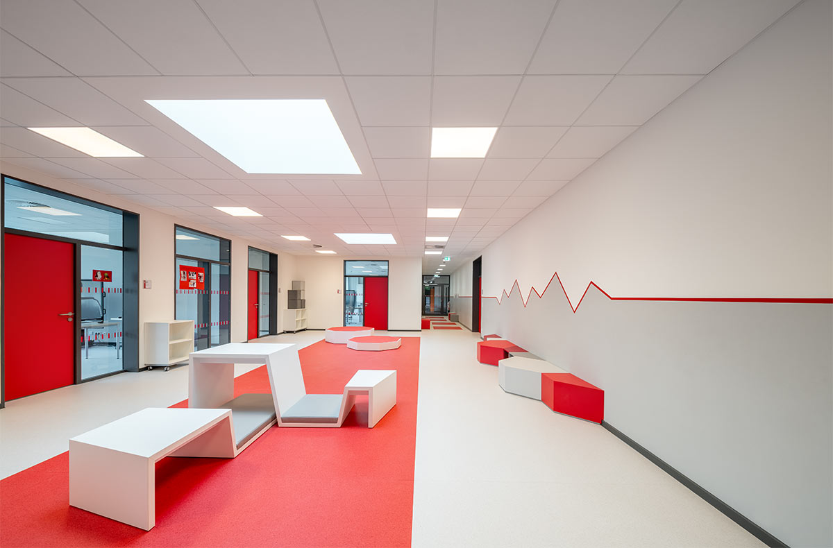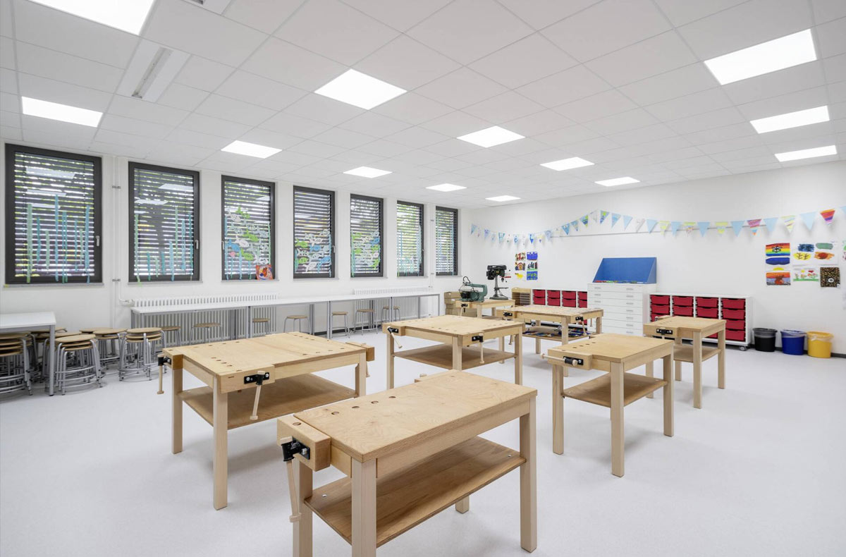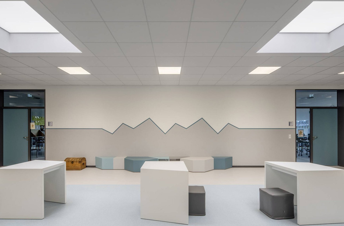 Im Zentrum des Lichtkonzepts für die Lessing-Grundschule steht die Arimo Fit. Sie kommt in den Klassenzimmern, in der Mensa und im Sanitärbereich zum Einsatz – jeweils mit maßgeschneiderter Lichttechnik, z. B. als asymmetrisches Tafellicht mit RAV-Optik. Die Leuchten wurden mit dem TRILUX Lichtmanagementsystem LiveLink vernetzt und mit Sensoriken zur Präsenz- und Tageslichtsteuerung ausgestattet. Ein Qualitätsfaktor: Als Human Centric Lighting Variante verändern die Leuchten die Lichtfarbe und -intensität im Tagesverlauf analog zum Tageslicht. Diese dynamische „naturidentische“ Beleuchtung wird als besonders angenehm empfunden und wirkt sich positiv auf den Schlaf-Wach-Zyklus und das Wohlbefinden aus.