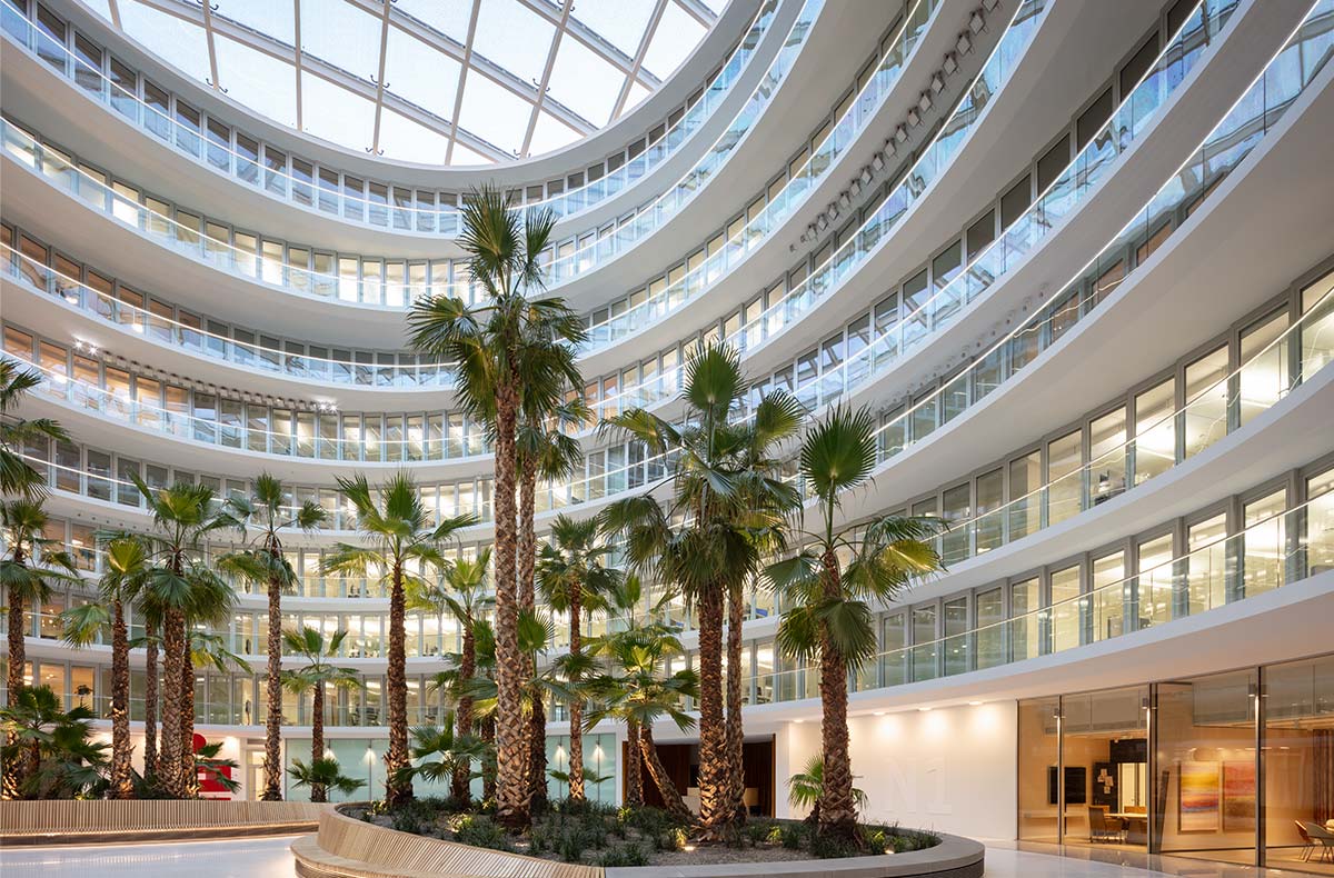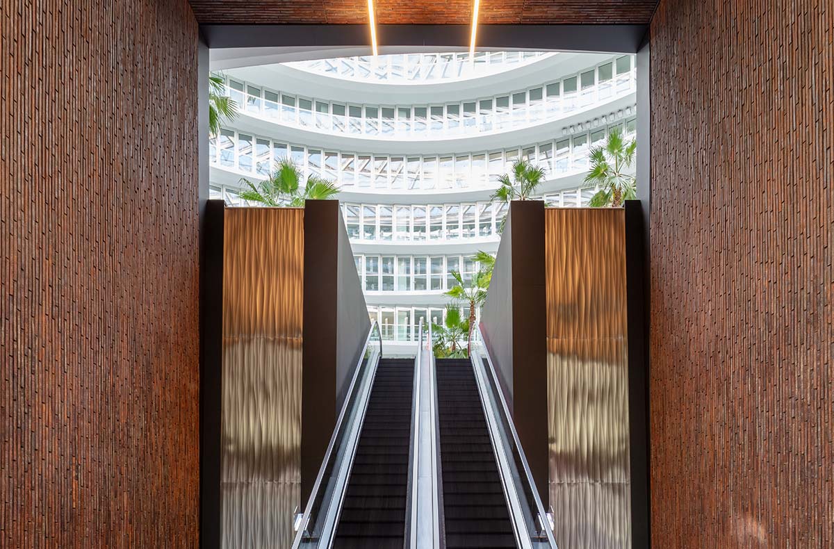 Insbesondere die 40 Meter hohe Palmenhalle mit Lichtkuppel, das Herzstück des Gebäudes, stellte eine besondere Herausforderung dar. Da in der Mitte der Halle keine Beleuchtung montiert werden durfte, mussten die eigens für das Projekt entwickelten Strahler in ca. 25 m Höhe seitlich montiert werden. Zahlreiche schwenkbare Canilo Strahler garantieren, dass ausreichend Licht Boden, Wege und Pflanzen erreicht. In Kombination mit Skeo Z Wandleuchten und Lutera Bodeneinbaustrahlern sorgt das Beleuchtungskonzept für ein stimmiges Gesamtbild, dass die außergewöhnliche Architektur des Gebäudes unterstützt und Besucher zum Verweilen einlädt.
