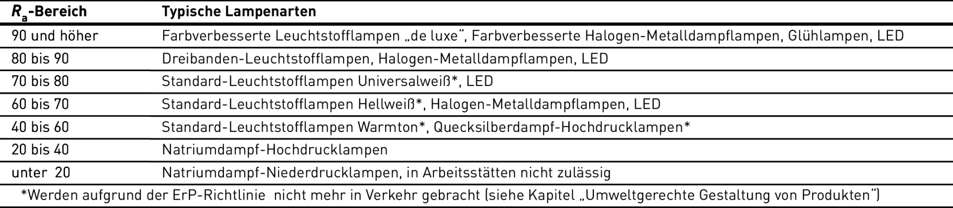 Leuchtmittel mit einem Farbwiedergabe-Index kleiner als 80 sollten nach EN 12464-1 in Innenräumen, in denen Menschen für längere Zeit (mehr als 2 Stunden) arbeiten oder sich aufhalten, nicht verwendet werden (siehe Kapitel, „Regelwerke”). Ausnahmen lässt die Norm für besondere Beleuchtungsaufgaben zu, wenn aus wirtschaftlichen Gründen Lampen hoher Lichtausbeute erforderlich sind, z. B. Natriumdampf-Hochdrucklampen, die nur eine geringe Farbwiedergabe aufweisen. Dies trifft z. B. für die Beleuchtung hoher Hallen zu. Jedoch sind in diesen Fällen geeignete Maßnahmen zu ergreifen, damit an festen und ständig besetzten Arbeitsplätzen und dort, wo Sicherheitsfarben fehlerfrei erkannt werden müssen, eine höhere Farbwiedergabe sichergestellt ist (siehe auch ISO 3864 „Grafische Symbole – Sicherheitsfarben und Sicherheitszeichen – Teil 1: Sicherheitszeichen an Arbeitsstätten und in öffentlichen Bereichen – Gestaltungsgrundsätze“). In der Praxis kann diese Problematik auf Grund der vorangeschrittenen Entwicklung effizienter LED-Leuchten heute schon als überholt angesehen werden. Bei hoher Lichtausbeute ≥ 130 lm/W und gleichzeitig guter Farbwiedergabe (Ra ≥ 80) können mit LED-Leuchten zu vertretbaren Kosten auch in industriellen Fertigungsstätten wirtschaftliche Beleuchtungslösungen umgesetzt werden. In Hallen mit geringer Tageslichtversorgung ist eine Beleuchtung mit einer circadianen Dynamik der Farbtemperatur empfohlen (siehe Kapitel „Human Centric Lighting”).