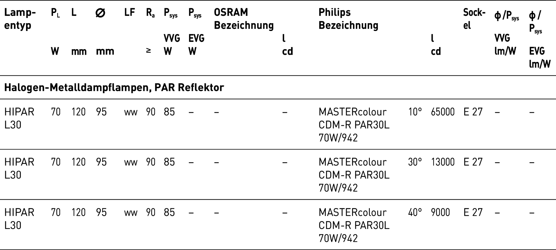 > Leuchtmittel / Lampentabelle / HIPAR 20