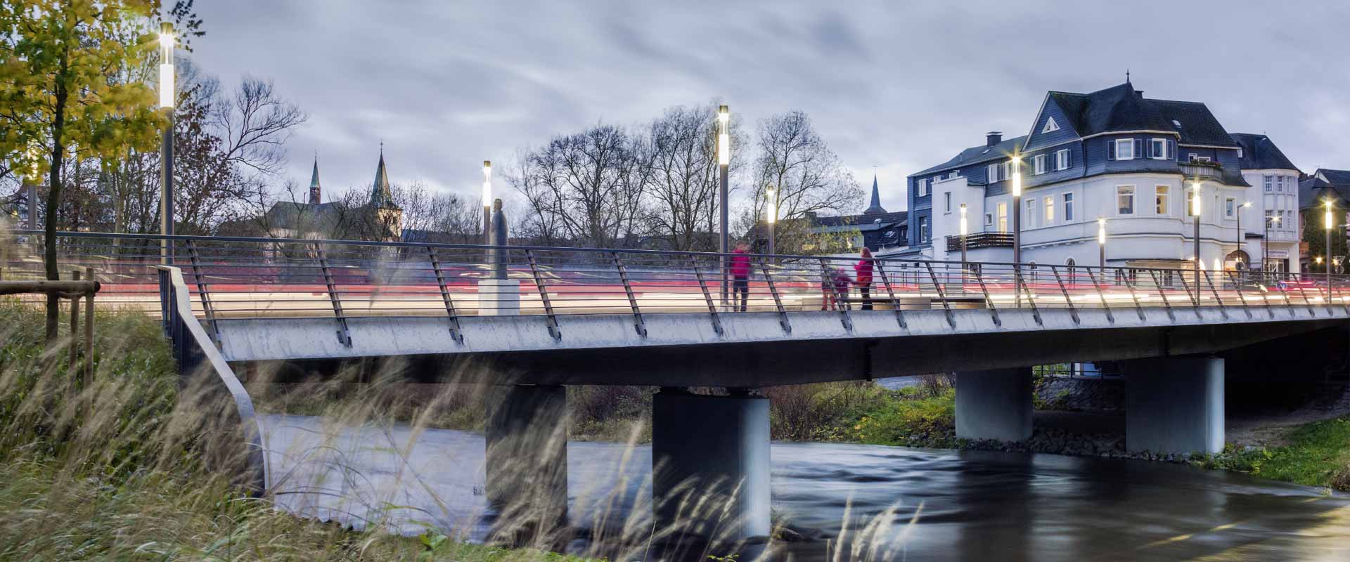 „Wir wollten den See näher an die Innenstadt heranbringen“, erklärt Rafael Czochara von der Stadt Meschede. So entstand die Idee vom Henneboulevard, der über die sogenannte Himmelstreppe direkt auf die Staumauer führt. Von hier aus gelangt der Spaziergänger über den Damm zu einem Pfad, der an einer Felsmauer entlang bis zum Schiffsanleger des Sees reicht. Einige imposante Lichtstelen aus dem Hause TRILUX