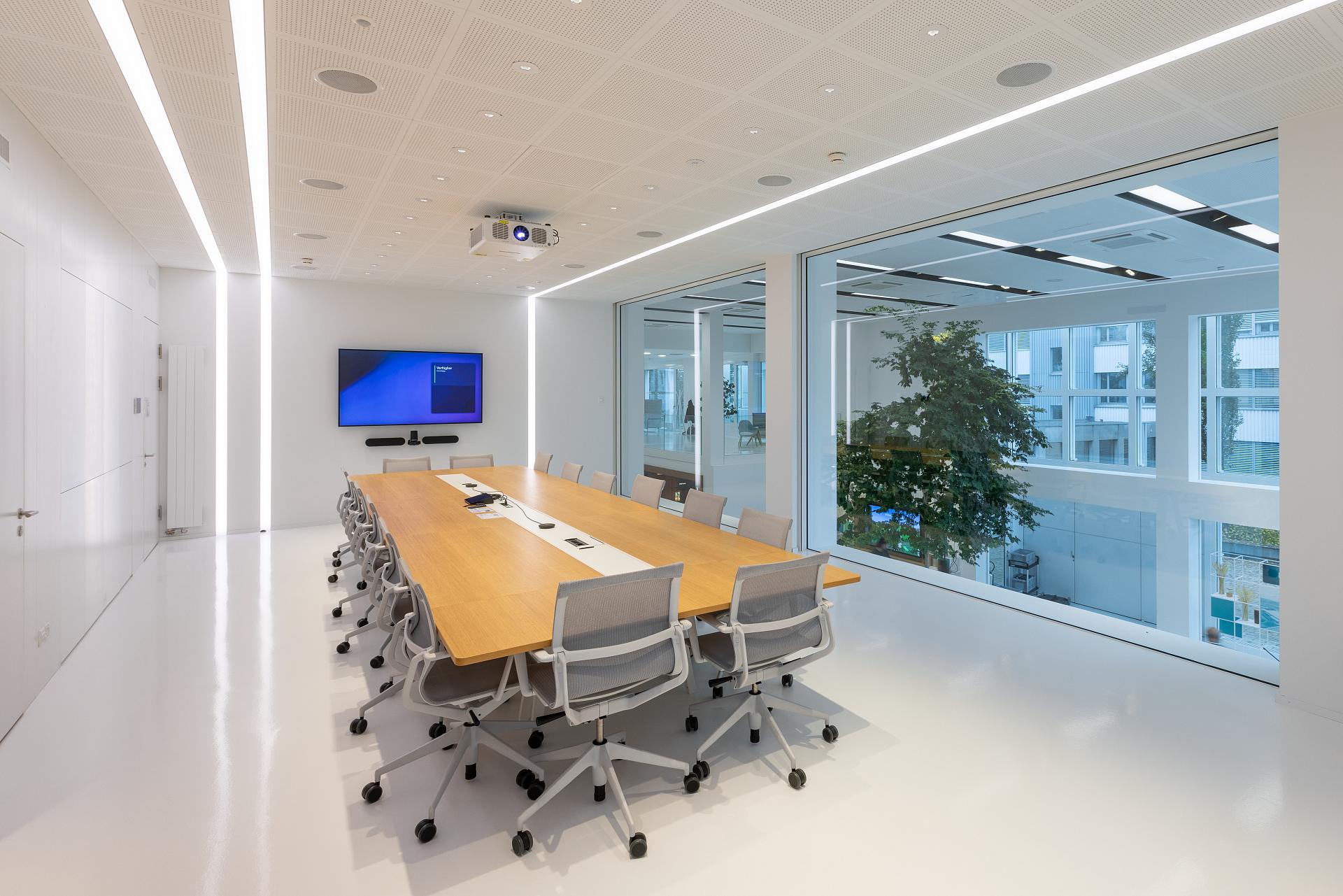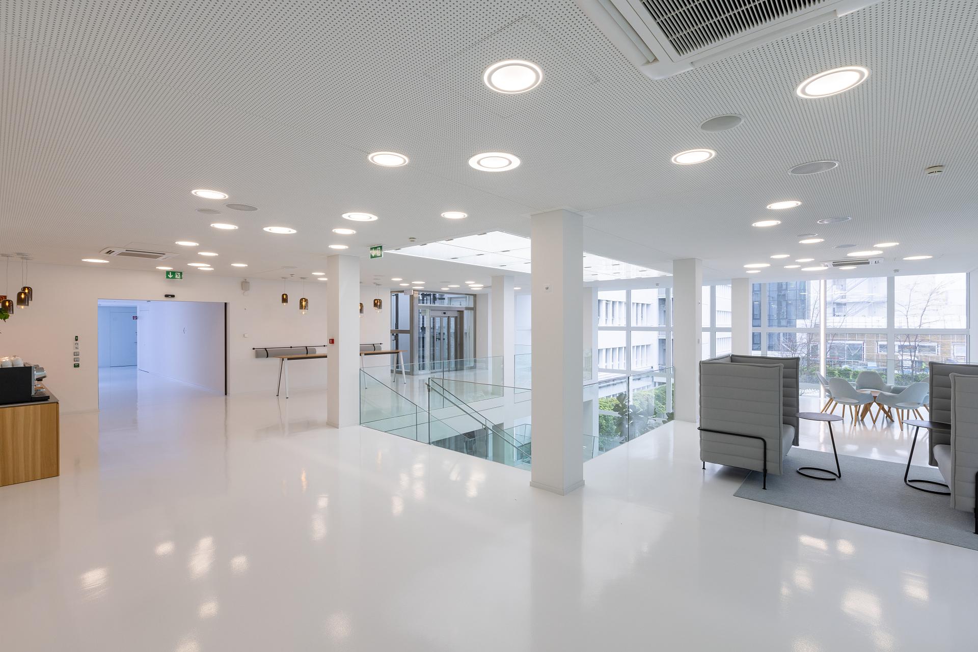 The 2,100 m2 Customer Centre is the first port of call for customers, partners, visitors and guests. With state-of-the-art meeting rooms, retreat areas and a café, it offers the perfect infrastructure for conferences, workshops and customer meetings. The lighting emphasises the unique character of the architecture with lots of glass, light-coloured ceilings and floors. The ambient lighting is provided by Polaron IQ recessed spotlights installed flush with the ceiling, reminiscent of a swarm of glowing UFOs. Their irregular arrangement structures the space, connects areas and guides you through the building. As part of the refurbishment, the existing luminaires were replaced with the latest generation of Polaron IQ luminaires. Particularly practical: thanks to a special housing that we developed for the project, we were able to utilise the existing ceiling cut-outs. We also ensure optimum visual conditions in all other areas - in offices, for example, with Opendo LED as a surface-mounted luminaire with UGR < 19 for VDU work.
