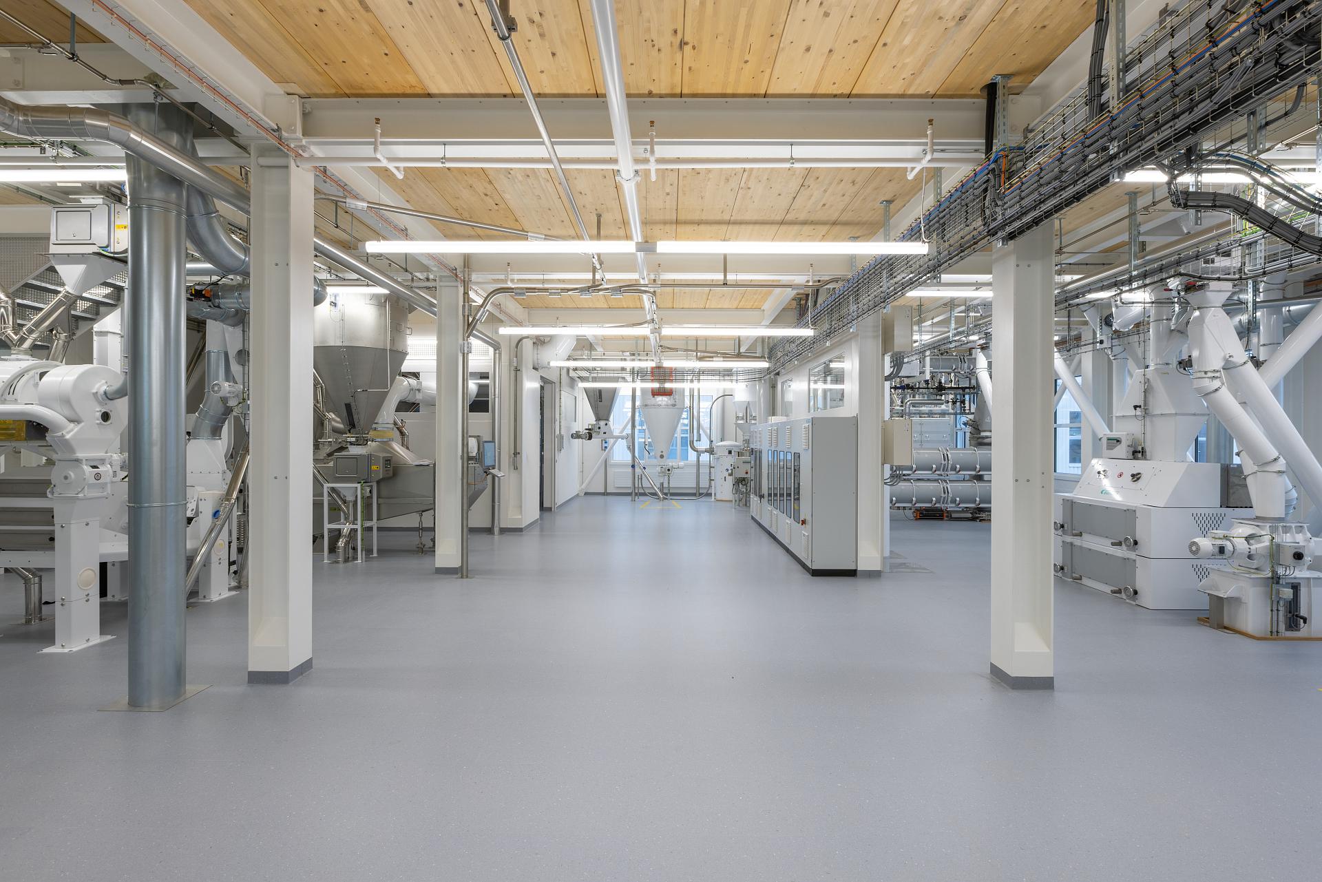 The ambience in the Milling Academy is much more industrial, but just as impressive. At the centre of the new 2,900 m2 building is a fully functional foam mill for practical experiments, demonstrations and training courses. The rooms are dominated by huge grinding mills and a technical infrastructure with white-painted and silver pipes and cables. A light-coloured wooden ceiling provides a warm counterpoint to the rough industrial atmosphere. Bühler AG was looking for an attractive lighting solution that would prove its worth in this demanding environment thanks to its efficiency, high quality of light and protection class. An indirect light component was also required to brighten up the ceiling. And our Tugra is one of the luminaires on the market that simultaneously offers a high protection rating and an indirect component. It was realised as a suspended linear light line with IP66. The luminaires were networked, connected to the existing building management system and combined with an emergency lighting solution from Inotec. The result is a perfectly illuminated, highly functional and equally prestigious industrial landscape.