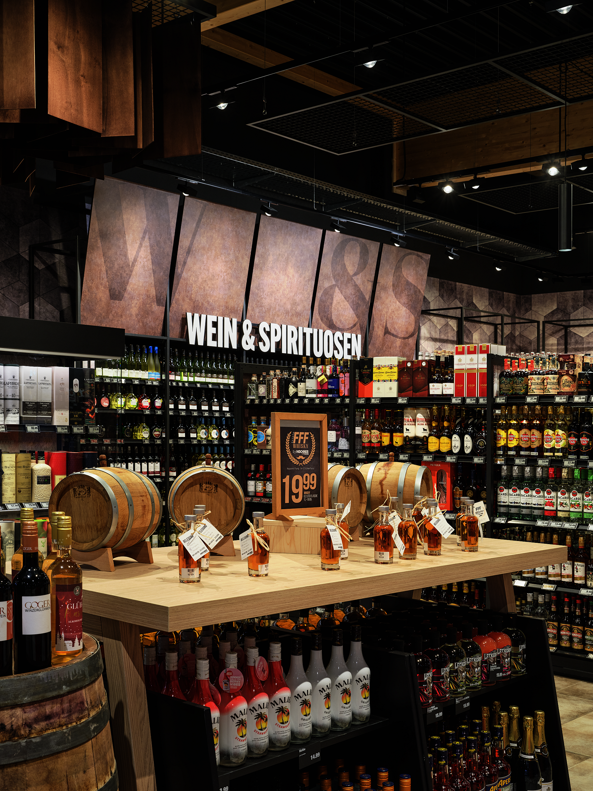 In order to optimally illuminate the various market areas and product ranges, the beam characteristics and light colours were individually adapted to the approximately 500 light points and the goods to be illuminated. The Yuvio Track in the particularly economical Efficient Cool light colour is used in the cosmetics department, while the Brilliant Food version is used in the wine department. The lighting of the graphics on the rear walls also plays a special role. Yuvio Track (Efficient White) with oval beam characteristics is used here. The rotatable Yuvio-Track spotlight with oval lens, which we have developed especially for retail applications, creates an oval light pattern with a particularly pleasant soft transition at the edges. This creates a visual expanse that makes the store appear larger and more open and improves the shopping experience. In the fresh food counter area with a slightly lower suspended ceiling, Quira recessed spotlights ensure attractively illuminated goods - for example with the special light colours Meat (meat and sausage products), Brilliant Food (cheese) and Efficient Cool (fish). The generous swivelling range of the recessed spotlight allows the goods to be perfectly displayed.