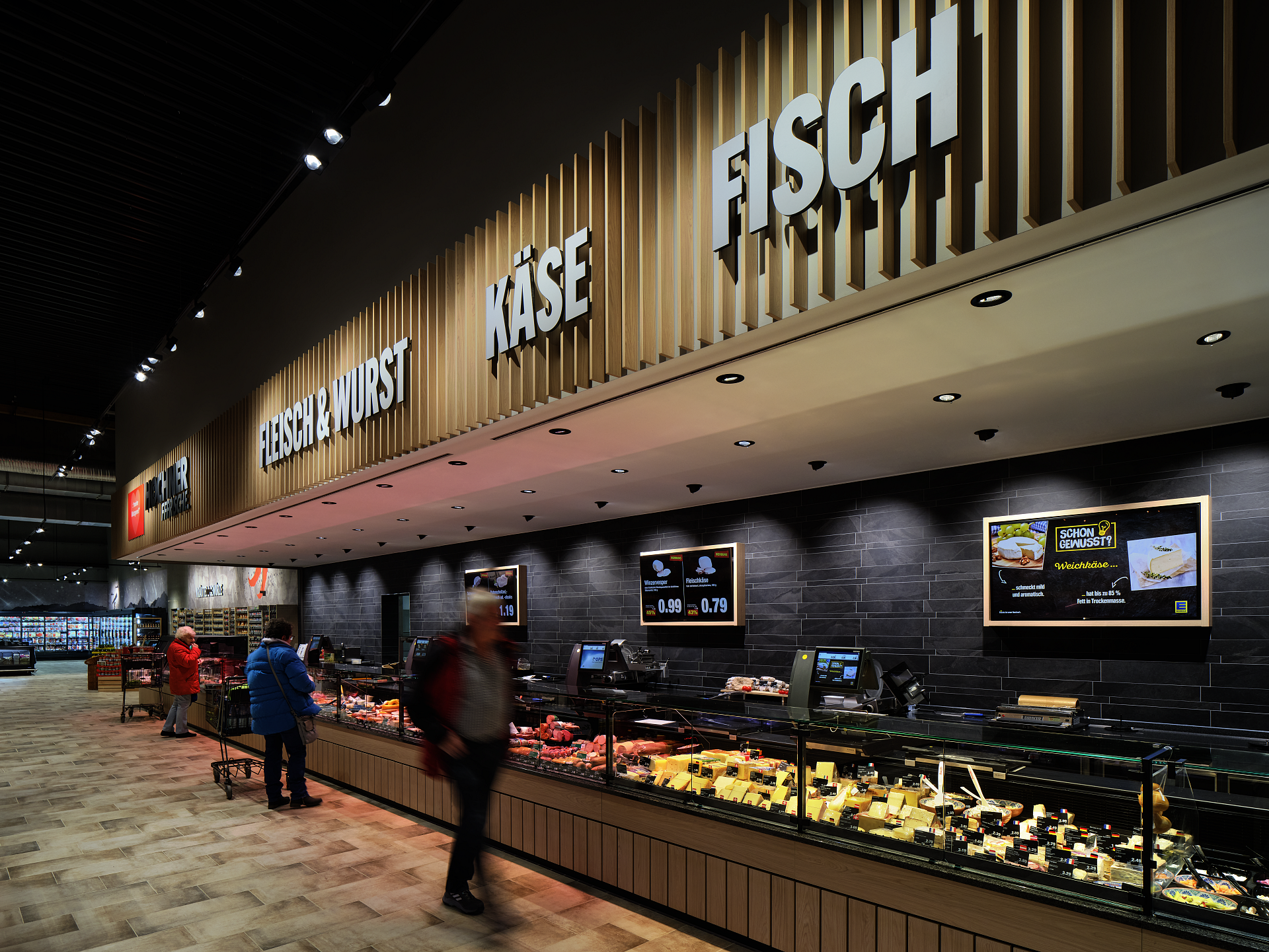 With Yuvio Track and Yuvio Twin, we have recently added two particularly attractive and flexible track spotlights to our portfolio - which have been honoured with the "iF Design Award 2025" and the "Red Dot Award: Product Design 2025", among others. As the luminaires were a perfect fit for the project, we presented them to the EDEKA NST project team in our showroom. And this after the initial planning steps had already been completed. The new Yuvio spotlights made an immediate impression and are now at the centre of the revised lighting concept. They provide the basic and accent lighting in the approx. 2,500 m² E-Center. In stylish black, they harmonise perfectly with the suspended light ceiling - and their high quality of light and colour rendering (CRI > 90) ensure optimum visual conditions and eye-catching product presentation throughout the market.