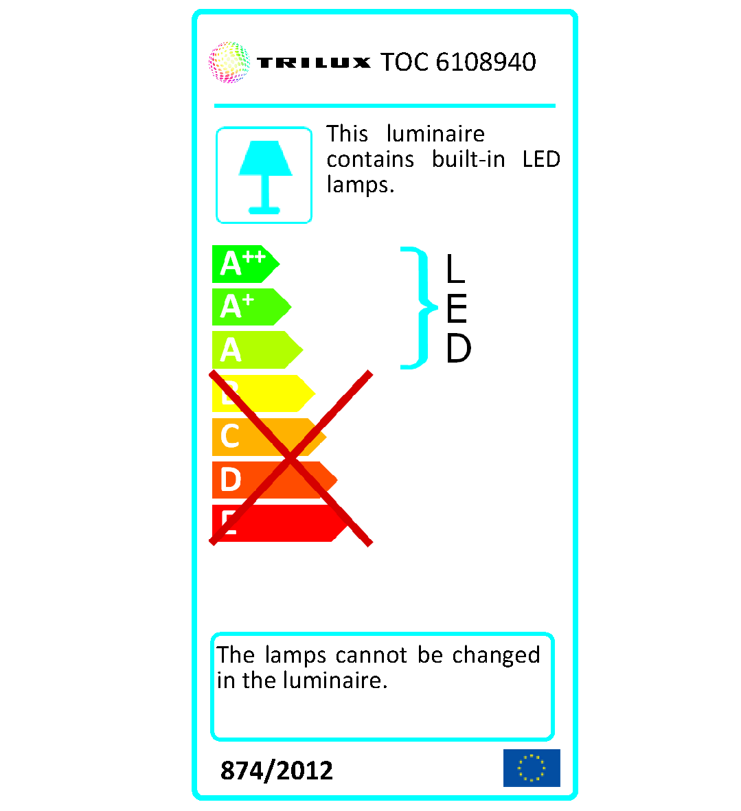 Energy labelling When offering lamps in retail sales today, retailers are legally obliged to clarify to the technically untrained customer how well the lamp is utilising electrical power to generate light. For this purpose, the European Union has passed directives on energy labelling for lamps:EU Directive 2010/30/EU [162] on the indication by labelling and standard product information of the consumption of energy Directive 874/2012/EU [182] with regard to energy labelling of electrical lamps and luminairesThese EU directives regulate labelling for electrical lamps and luminaires. Lamps to be labelled since the amendment in 2012 fundamentally include all lamps for household and professional use, such as:incandescent lamps, fluorescent lamps, high-intensity discharge lamps, LED lamps and LED modules.The following are exempt from labelling:lamps and LED modules with a luminous flux below 30 lumens (lm); lamps and LED modules marketed for use with batteries; lamps and LED modules marketed for applications where the primary purpose is not lighting; lamps and LED modules marketed as part of a luminaire and not intended to be removed by the end user, except when they are offered or displayed to the end user in a separated fashion (e.g. as spare parts) for sale, rent or instalment purchase; lamps and LED modules marketed as part of a product whose primary purpose is not lighting. However, if they are offered or displayed in a separated fashion (e.g. as spare parts) for sale, rent or instalment purchase, the directive applies to them. Lamps and LED modules which do not fulfil the requirements that must be applied due to regulations on implementing the Directive 2009/125/EC of the European Parliament and of the Council from 2013 and 2014; luminaires exclusively designed for operation with the lamps and LED modules mentioned in the first three points.The following are exempt from labelling:all lamps with a luminous flux in excess of 6.500 lumens lamps with a power consumption below 4 watts all low voltage halide lamps reflector lamps battery-operated lamps lamps not primarily intended for lighting, e.g. UV, IR, black light and germicidal lamps as well as all lamps for special applications and lamps predominantly used in commercial settings such as high-intensity discharge lamps and low-pressure sodium vapour lamps.The labelling of lamps or their packaging, as is the case e.g. with refrigerators, mostly consists of an energy efficiency label containing the colour scale of energy efficiency classes A++ (very efficient) to E (inefficient) and possibly data on lamp luminous flux, lamp wattage and average service life. Measurement methods for determining the energy efficiency class are defined in EN 50285 "Energy efficiency of electric lamps for household use – Measurement methods". For LED lamps, the general classification is A to A++ .