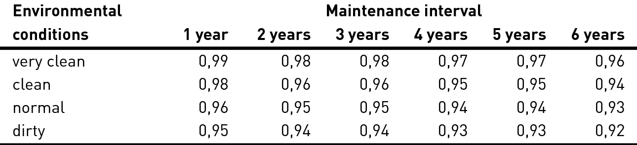 After three years, the reduction in reflectance values slows down noticeably and the reflectance values of very clean and clean rooms increasingly turn into a constant value. For medium and highly soiled rooms, this generally does not apply. The room maintenance factor is dependent on the luminaire’s illuminance distribution (direct, direct-indirect or entirely indirect) and marginally also on room size. The following tables (a) to (i) contain the room maintenance factors according to CIE 97.2 amended by values for very clean rooms according to experience as well as measured values which are extrapolated for maintenance intervals of up to 6 years.