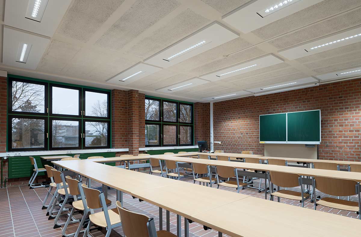 Classrooms are dynamic learning environments with changing phases of activity. The light should be switched off automatically during breaks and after school to save energy. Daylight-dependent control also ensures a constant, standard-compliant lighting level. IntuSens sensors based on DALI-2 enable efficient and convenient control of light in classrooms.
