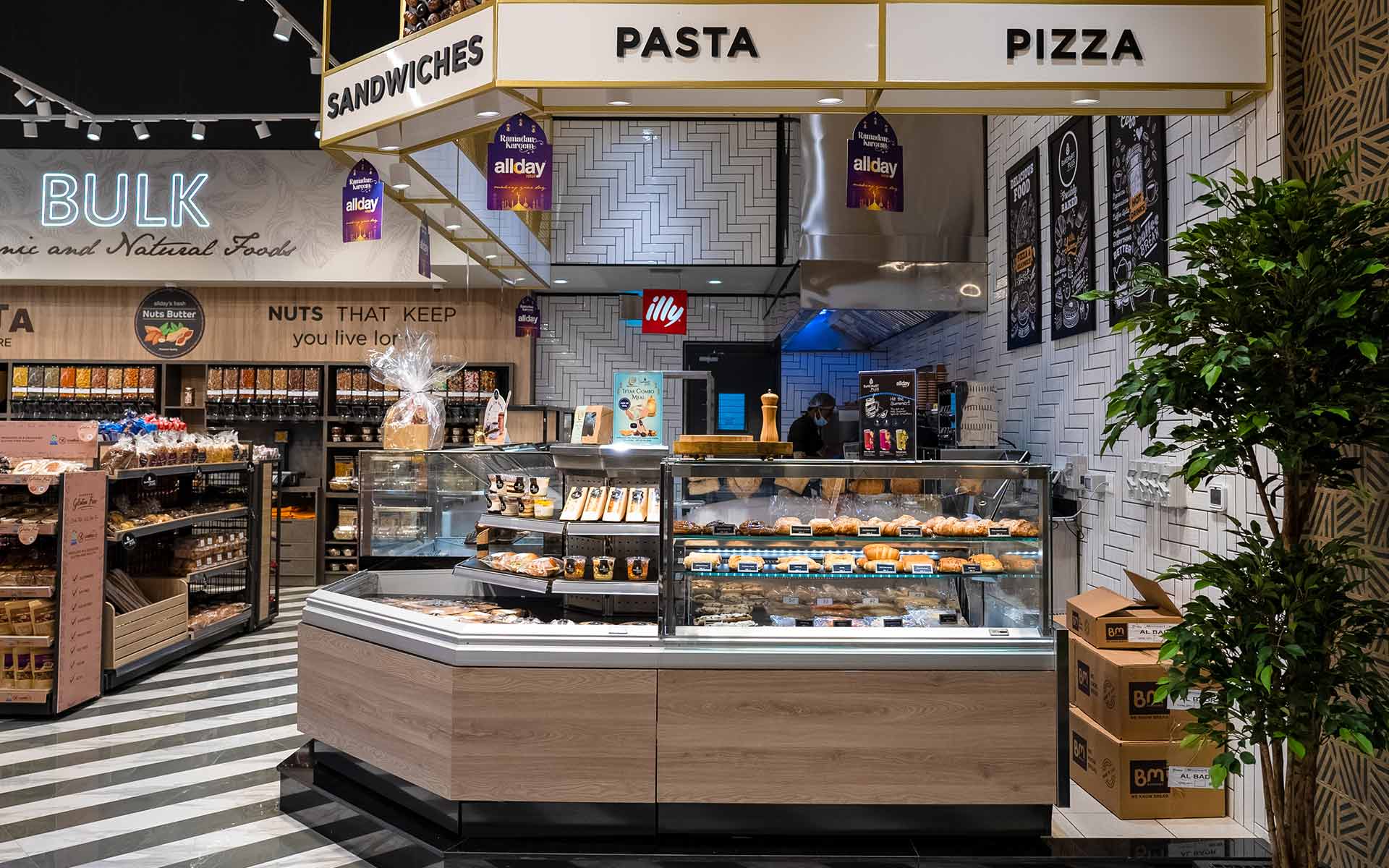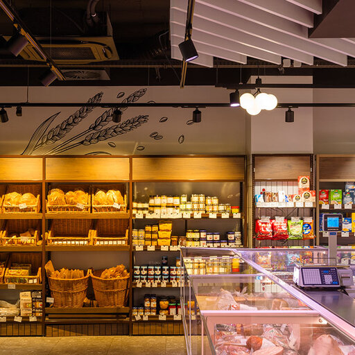 AllDay se esfuerza por satisfacer estas demandas y ofrece una gama de productos excepcionalmente diversa en una superficie de ventas de 1.000 metros cuadrados. Materiales modernos y de alta calidad adornan los estantes y mostradores de servicio, mientras que el nuevo concepto de iluminación no sólo muestra la variedad de productos sino que también cultiva una atmósfera acogedora diseñada para que los clientes se sientan a gusto.