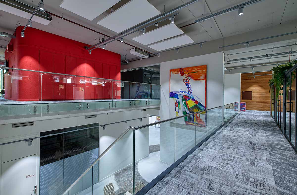Die Beleuchtung ist eines der sichtbaren Aushängeschilder. Mit der drahtlosen Lichtsteuerung Mymesh, die in die hochwertigen LED-Leuchten von TRILUX integriert ist, bietet das System weit mehr als nur Beleuchtung. Es verbindet Daten, Komfort und Energieeffizienz zu einem intelligenten Ökosystem.