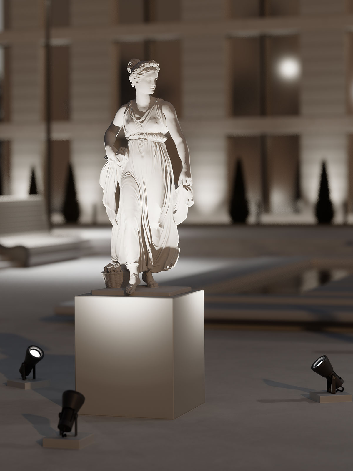 Narrow distribution outdoor luminaires such as Faciella can be used to emphasize facade details such as figures, clocks or gables. Medium-width light distributions are suitable for illuminating trees or objects in open spaces with three luminaires offset by 120° all around. Place Faciella spotlights on concrete bases in lawns or on walls - this way you avoid damage, e.g. by lawn mowers.