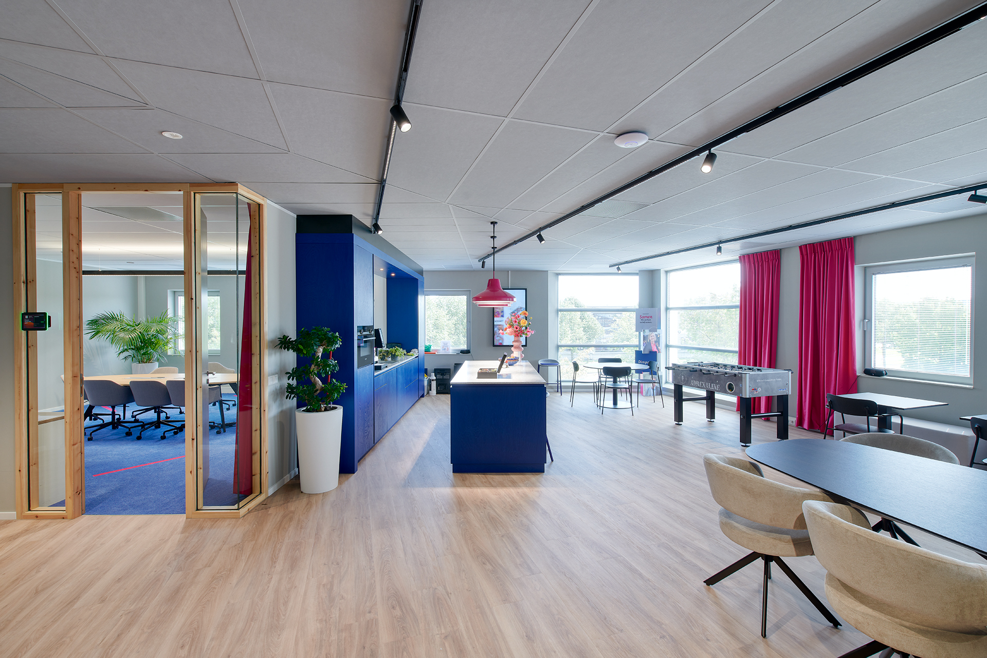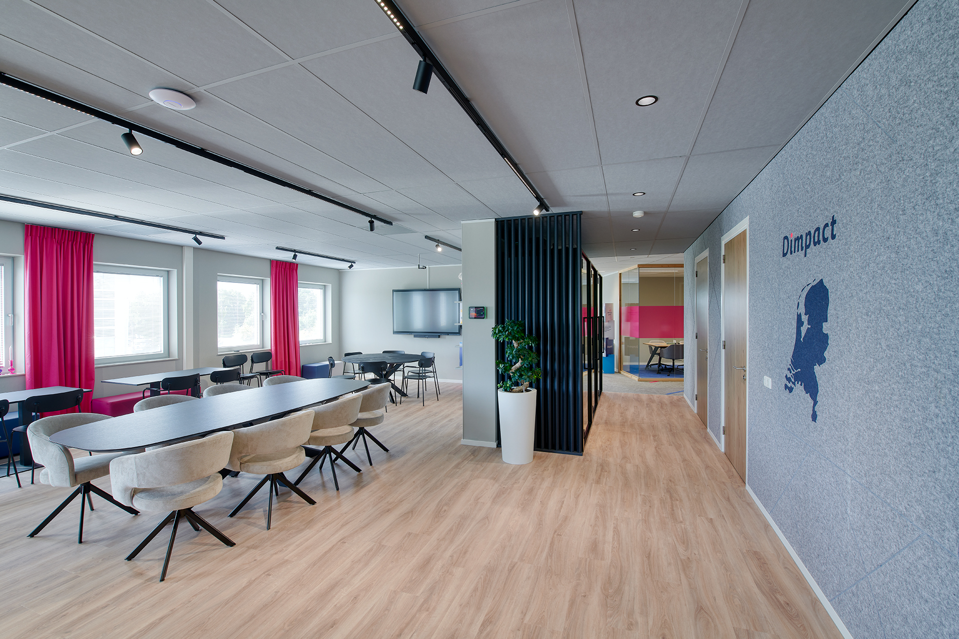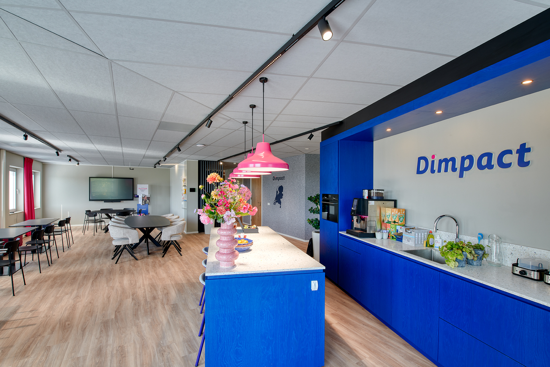 Het ontwerp van DRDS combineert warme materialen met moderne accenten. In de kantoren hangen functionele bandrasters, maar in de algemene ruimtes is zichtbaar aandacht besteed aan sfeer en uitstraling. “Van het werkcafé tot de kantine en ontmoetingsplekken, daar komt het design tot leven,” stelt Middag. De huisstijl van Dimpact is op maat en subtiel verweven, zoals in de roze Limba-pendelarmaturen boven de keuken.