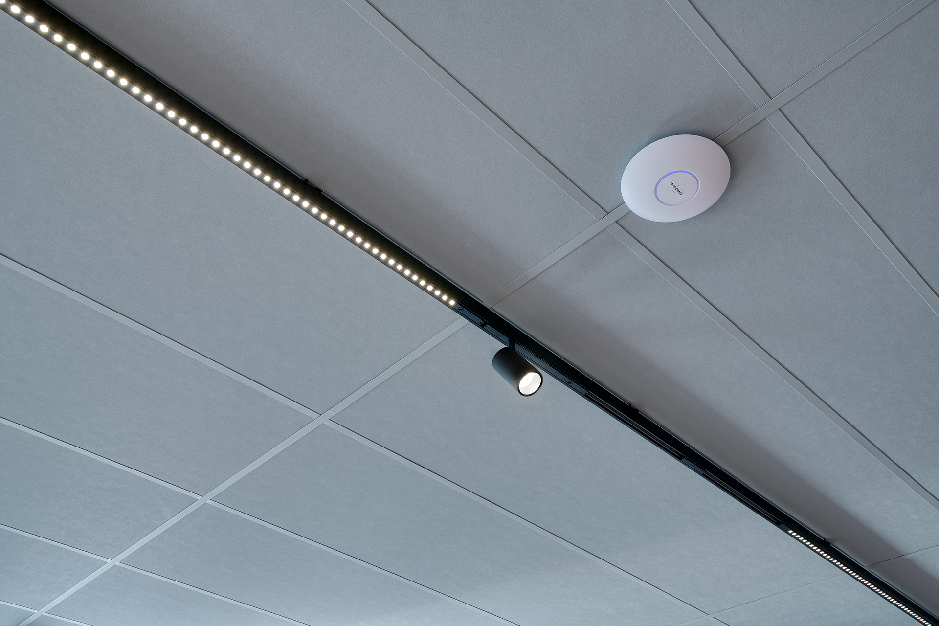 Een bijzonder element in dit project is het nieuwe RAIL-systeem van TRILUX. “Een echte gamechanger,” volgens Middag. Met 230V op de rail zijn er geen aparte drivers meer nodig. Lange afstanden zijn hierdoor niet langer een probleem en het plafond oogt rustig en strak. Vlak geïntegreerde armaturen en invisible adapters zorgen voor een minimalistische uitstraling, terwijl de Lenty-spotlights accenten in het kantoor zetten, zorgen de Linell-modules voor comfortabel omgevingslicht. Het systeem is flexibel in montage en kan zelfs gebogen worden. “Voor ons betekende het dat we creatieve vrijheid hadden zonder concessies te doen aan techniek of comfort,” aldus Middag.