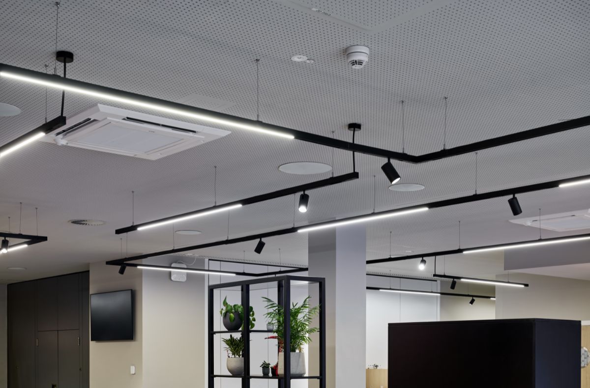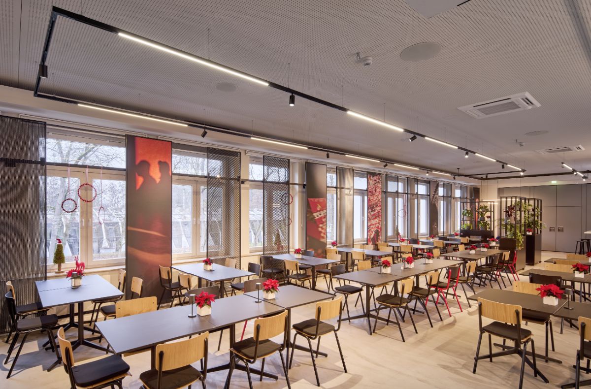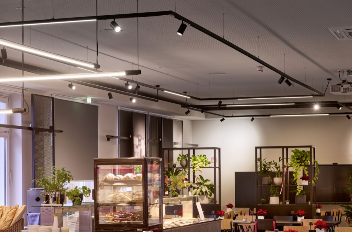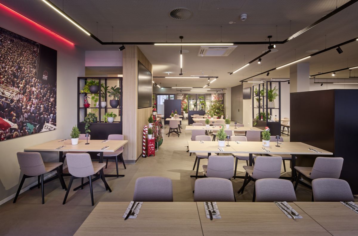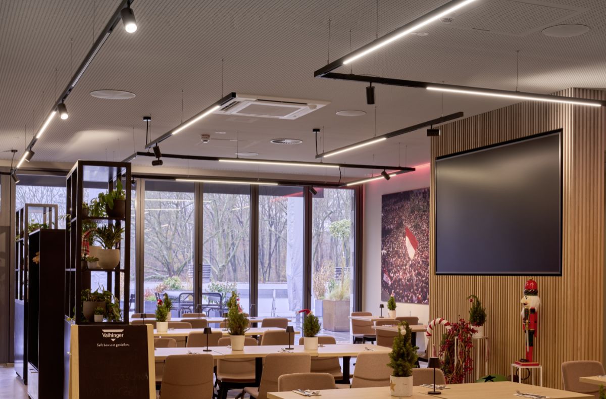 Het clubhuis van ongeveer 500 m2 is verdeeld in verschillende gebruiksruimtes. Naast een restaurant dat toegankelijk is voor het publiek, is er een multifunctionele ruimte (gemengde zone) voor team- of mediabesprekingen en aparte lounge- en werkruimten voor werknemers. Het zeer flexibele Rail systeem bleek overal de perfecte oplossing te zijn. Afhankelijk van de vereisten wordt het gebruikt als een lineaire of rechthoekige gesloten versie en is het uitgerust met verzonken Linell inzetstukken voor sfeerverlichting en Lenty spots voor aantrekkelijke accenten. De armaturen zijn in een netwerk opgenomen en voor de besturing aangesloten op het bestaande DALI lichtmanagementsysteem van het gebouw. Hierdoor kan de verlichting flexibel worden aangepast aan veranderingen in het gebruik van de ruimte, bijvoorbeeld voor grotere evenementen.