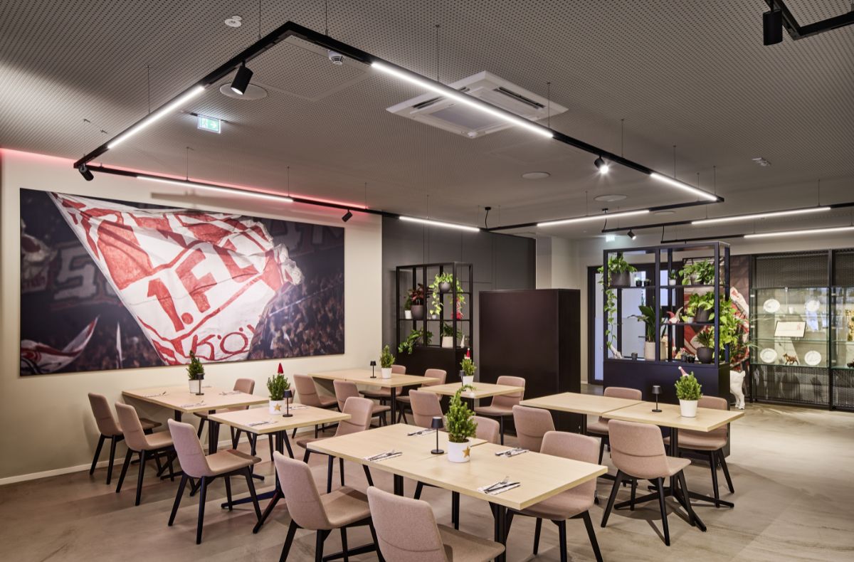 Als langdurige businesspartner van 1.FC Köln hebben we al talloze projecten samen gerealiseerd, van de verlichting van de sporthal en de kleedkamers tot de trainings- en fysioruimte. De voetbalclub is momenteel bezig met een grondige renovatie van het traditionele sport- en trainingscentrum Geißbockheim in de groene gordel van Keulen. Een centrale bouwsteen: de transformatie van het voormalige restaurant tot een eigentijds clubhuis en een levendige ontmoetingsplek voor fans, leden, medewerkers en bezoekers. Onze opdracht: een verlichtingsconcept dat alle ruimtes perfect verlicht, de identiteit van de traditionele club weerspiegelt en bovendien snel en eenvoudig te realiseren was. Een duidelijk geval voor ons universele flexibele systeem Rail.