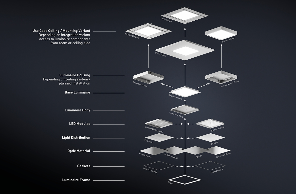 Inlegarmaturen voor roosterplafonds in verschillende formaten vormen de basis voor de Fidesca-productfamilie. Daarvan uitgaand biedt het modulaire platform bijkomende montageoplossingen voor de meest uiteenlopende plafondconstructies. Zo kunnen werkelijk alle denkbare situaties in de cleanroom effectief en alom verlicht worden.