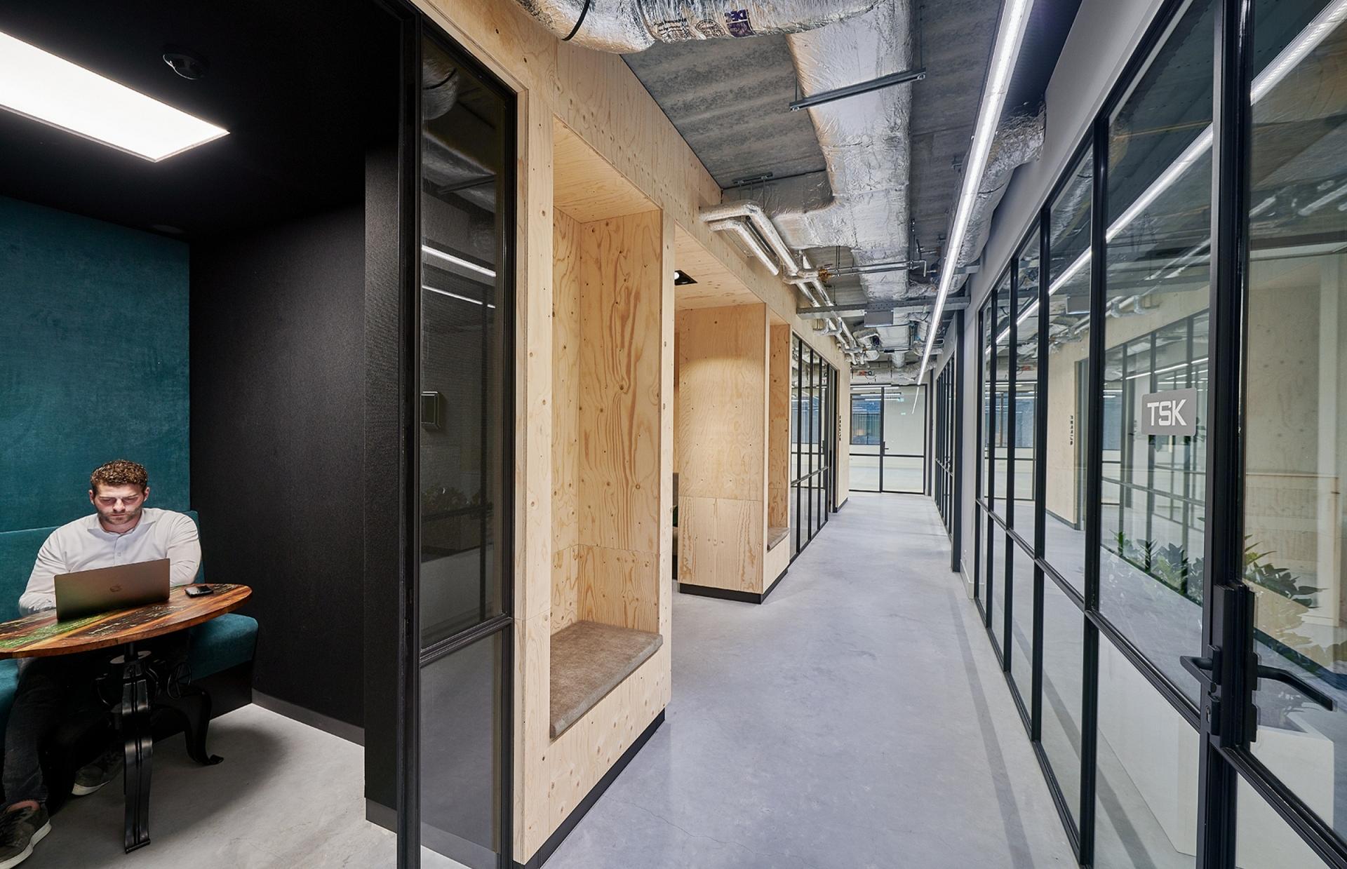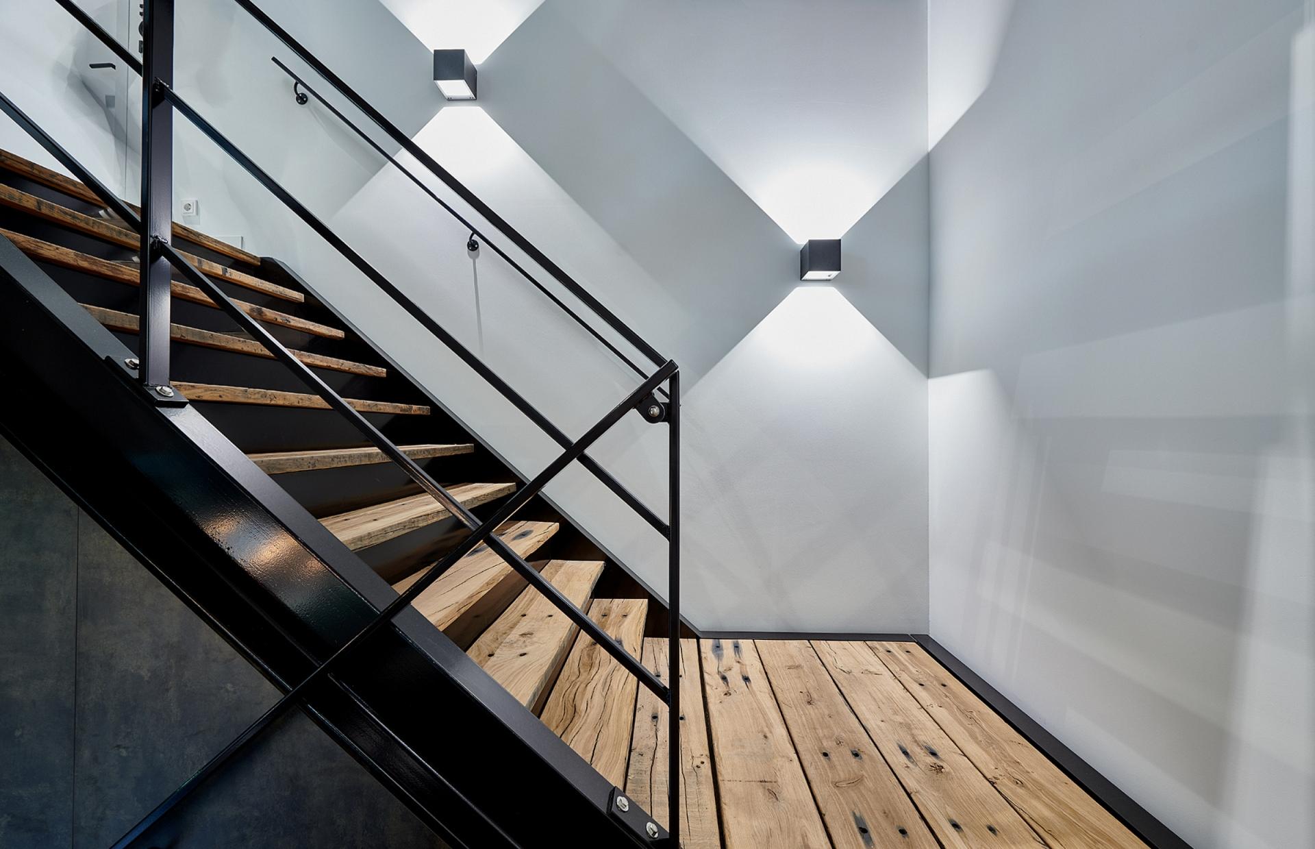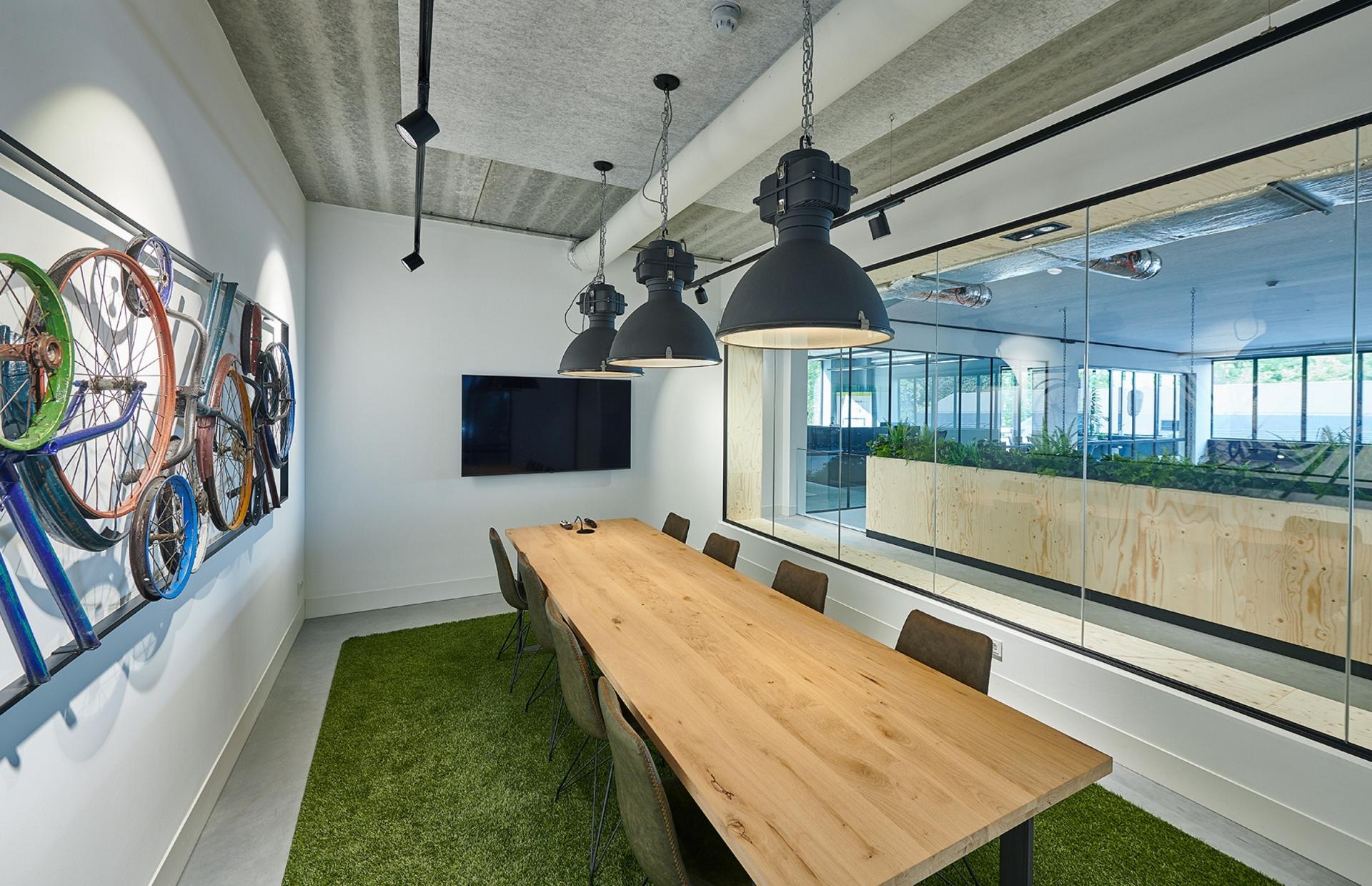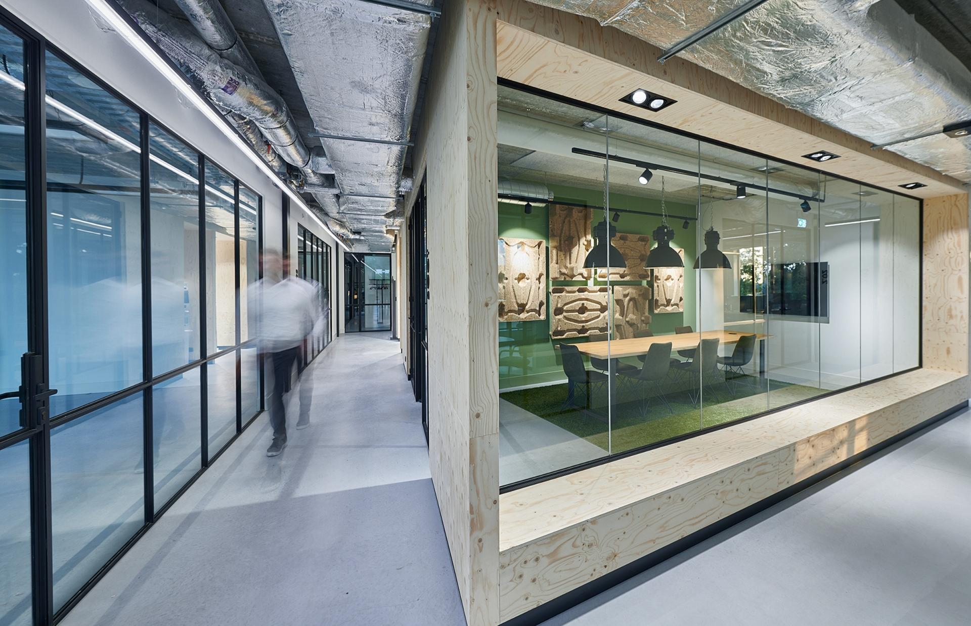 In de kantoorunits zijn armaturen zoals Arimo Fit, E-Line met asymmetrische lichtverdeling en Systema Compact toegepast, afgestemd op verschillende werk- en ontmoetingsruimtes. Voor de Arimo Fit is een speciaal op maat gelast frame ontwikkeld, waardoor het armatuur een industrieel uiterlijk krijgt. B.Veo spots op track zorgen voor flexibele accentverlichting, terwijl Skeo Q, normaal een buitenarmatuur, hier binnen voor een robuust en industrieel accent is ingezet.