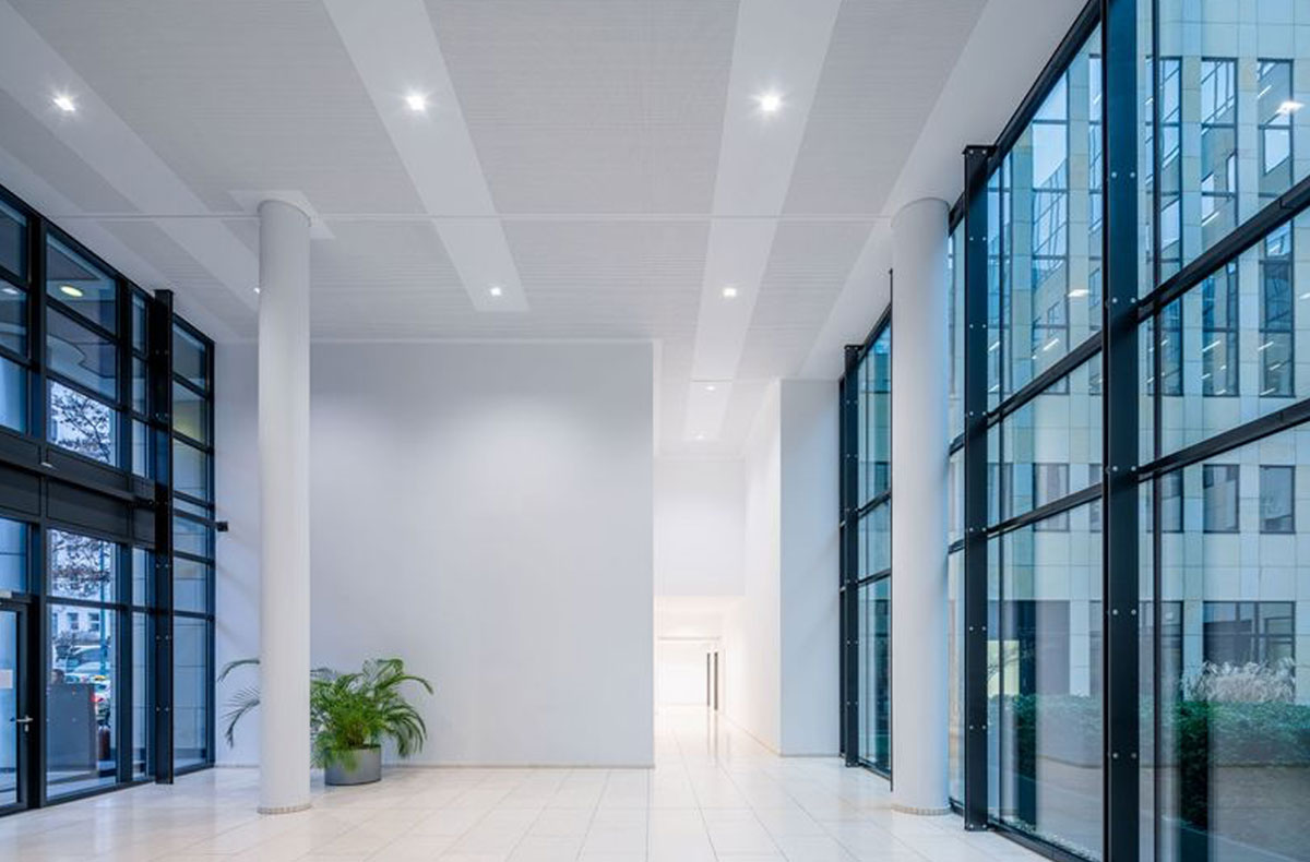 Licht helpt bij het uitstralen van een representatieve architectuur. Dit was nodig om in de ruimte van 44.000 vierkante meter, uitgestrekt over zeven verdiepingen, een moderne werkomgeving te kunnen creëren. In plaats van zwenkbare armaturen te gebruiken werd er gekozen voor inbouwgalerij-dakramen die parallel aan de gebouw as staan. Deze unieke greep uit de ‘trukendoos’ van TRILUX zorgde voor een indrukwekkende sfeer in de ruimte. Ook de nieuwe vloerbedekking die in dezelfde richting van het licht loopt, helpt hierbij. Het lijkt er nu bijna op dat de arcadedakramen het binnenvallende daglicht de kamer zuiver binnenlaten. “Dit is precies hoe de architect zich de implementatie van zijn concept had voorgesteld”, vertelt Karin Kühl van DVAG.