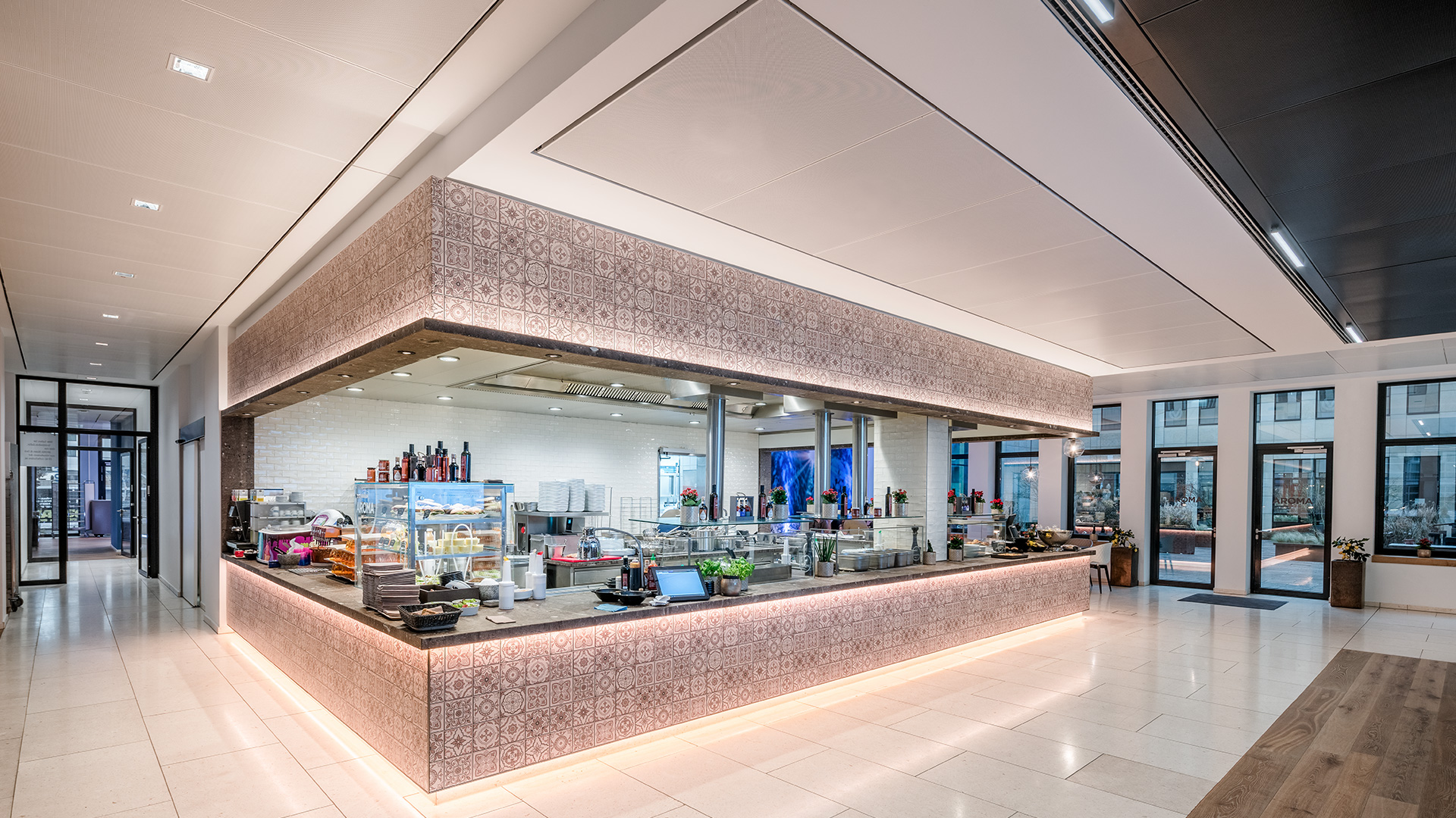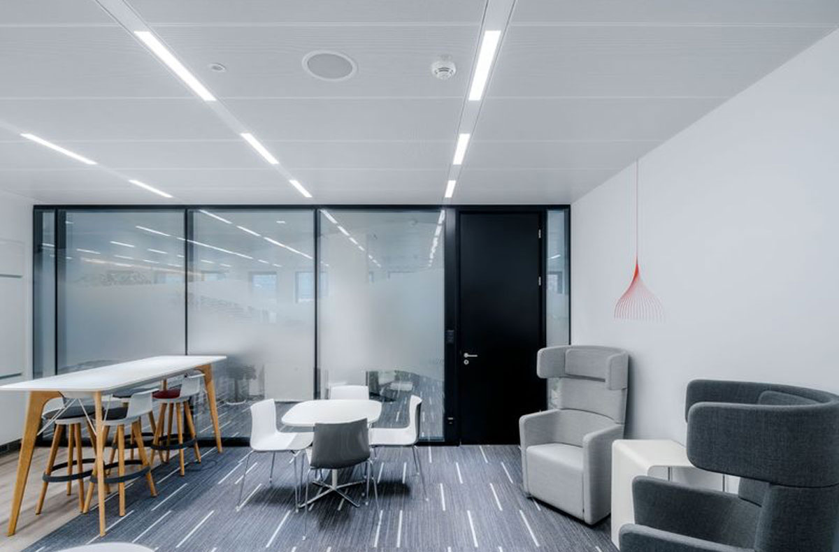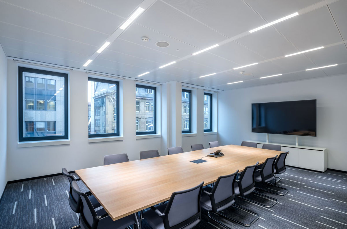 De grote dakramen passen dankzij het bijzondere design mooi in het rasterplafond. TRILUX zorgde voor speciaal aangepaste verlichting, zodat het licht parallel aan alle normen kan voldoen. “De E-Line LED was de juiste keuze”, vertelt Karin Kuhl overtuigend. De strookverlichting die ooit voor de industrie werd ontwikkeld, werd tot nu toe niet beschouwd als typische kantoorverlichting. “Dankzij de flexibiliteit en het zeer eenvoudige ontwerp geeft het de kantoren een vriendelijke en uitnodigende sfeer, dat is precies wat we wilden bereiken!”