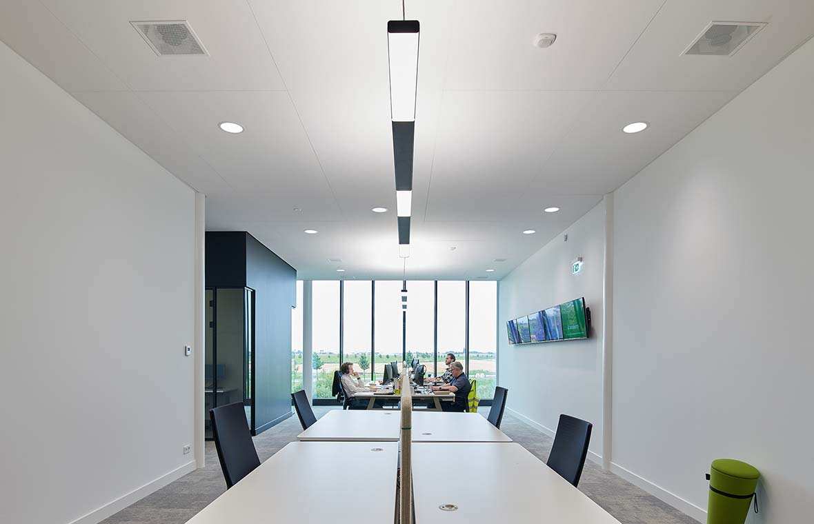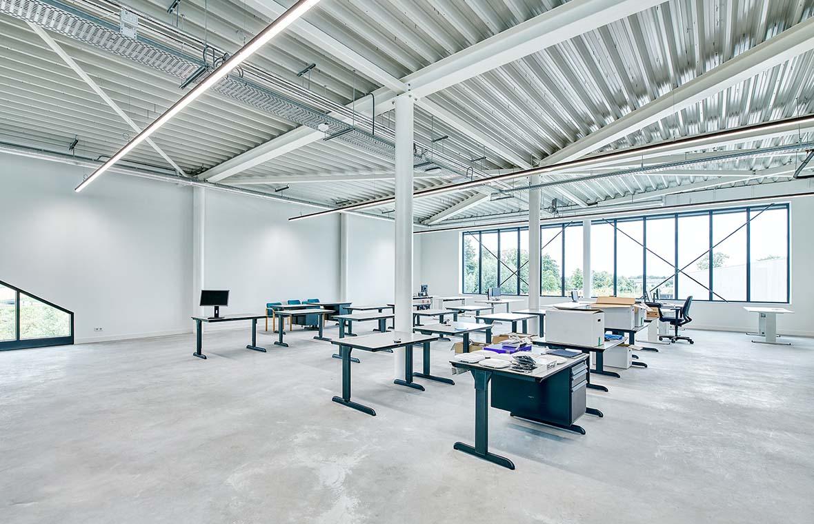 Indirect licht valt over de werkplekken via pendel-LED-armaturen, wat zorgt voor een prettige en ruimtelijke werksfeer. Elegante, lange lichtstrips verzorgen de basisverlichting, afgewisseld met LED-spots voor accentverlichting. In de daglichtkoepels is sfeerverlichting geïntegreerd om het effect van het trappenhuis en de koepel te versterken.