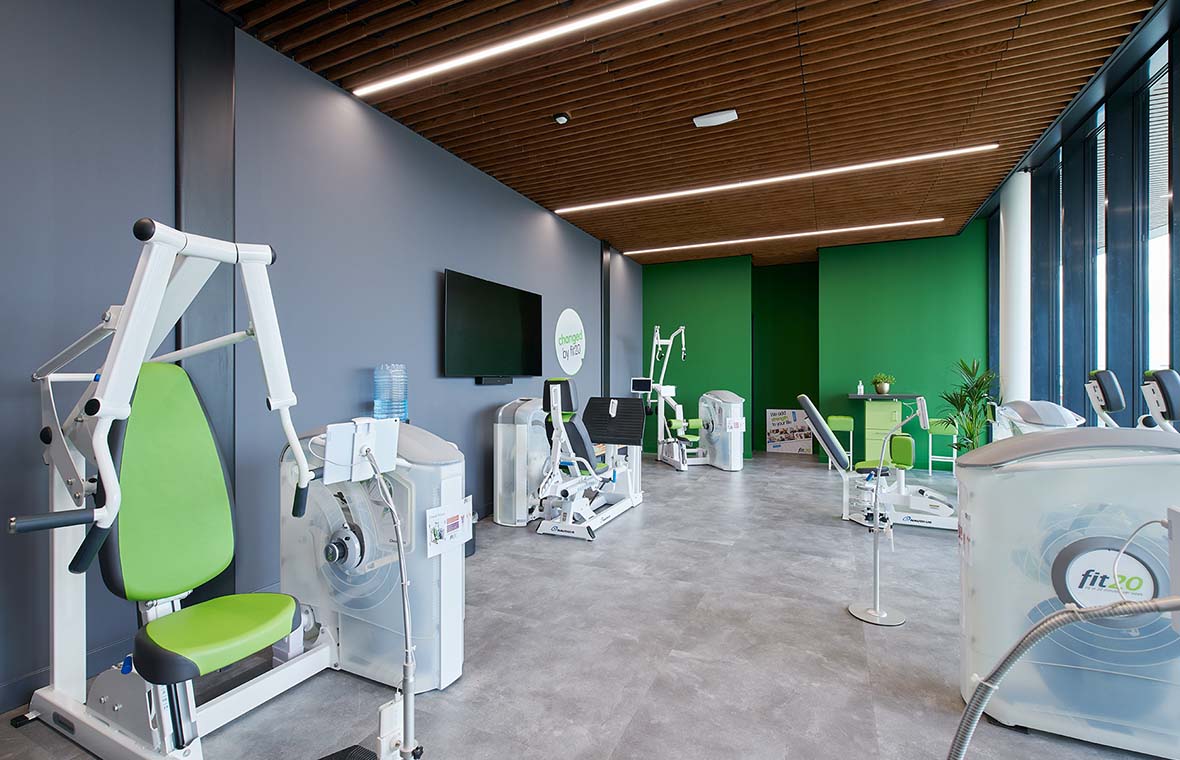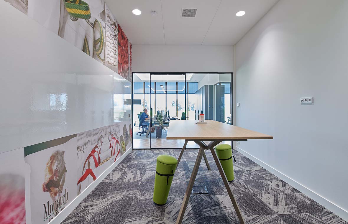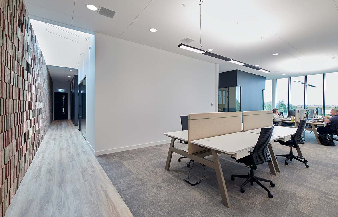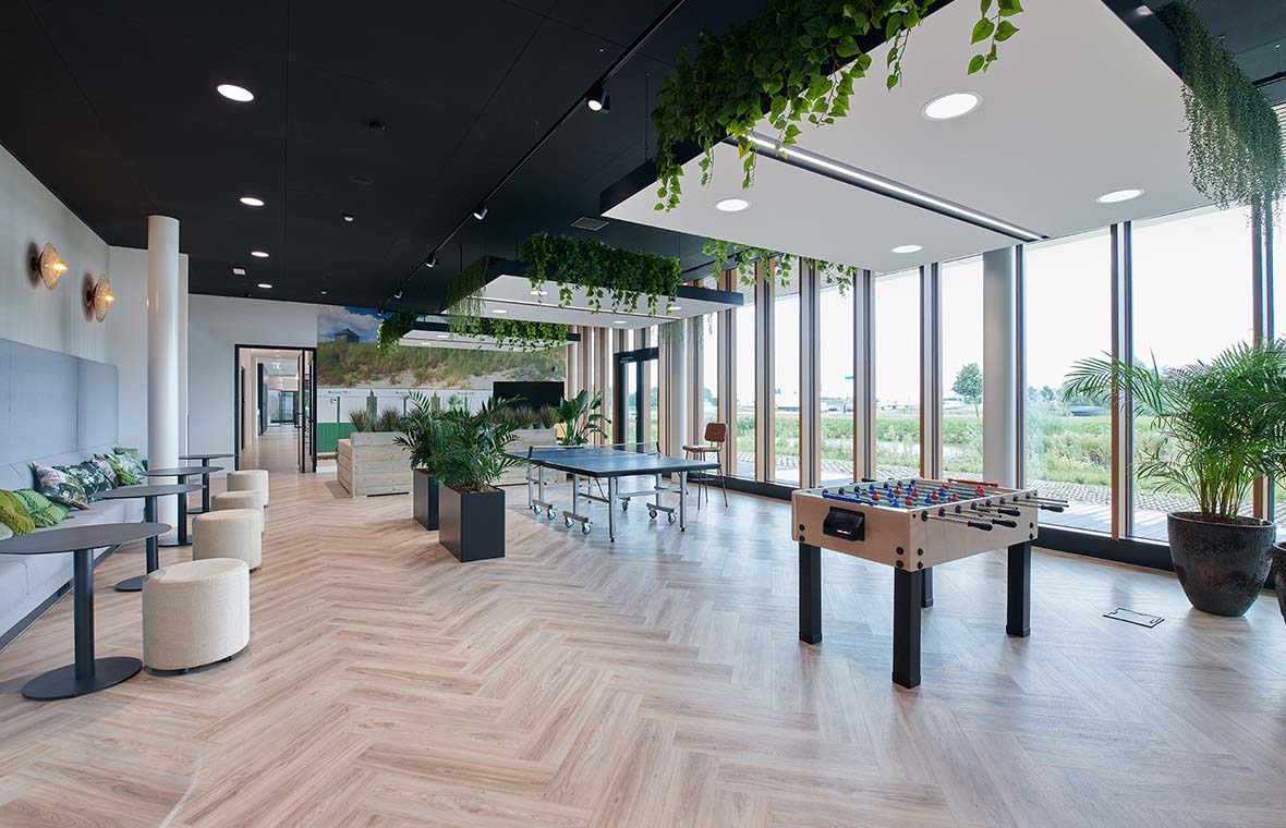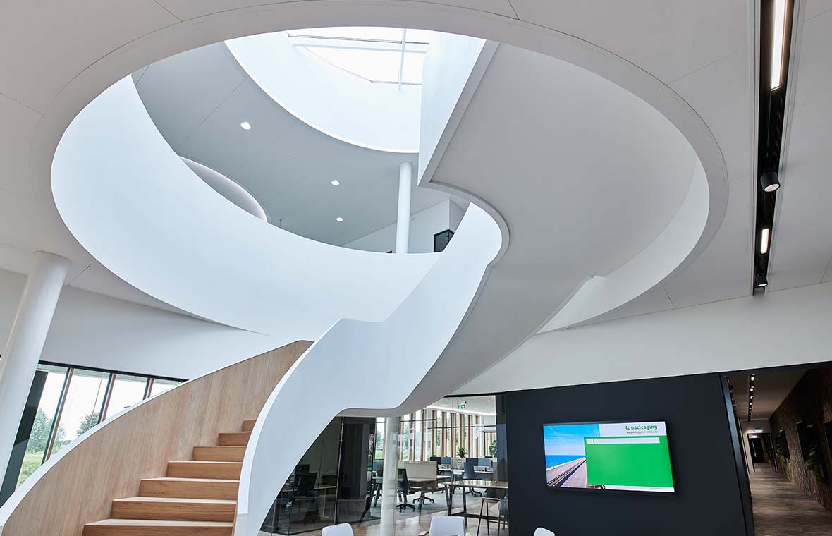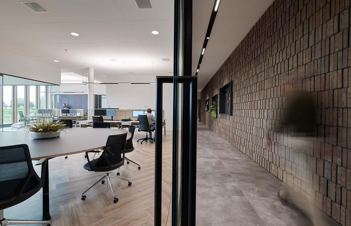 Het ronde stalen trappenhuis trekt direct de aandacht, badend in het natuurlijke licht dat via de glazen koepel naar binnen valt. Het kantoor biedt een aangename werkomgeving met uitzicht op het groene water vanaf de glazen wanden. Houten accenten, planten en andere natuurlijke elementen zorgen voor een warme sfeer. Voor de medewerkers is een fitnessruimte aanwezig en daglicht wordt optimaal benut, aangevuld met hoogwaardige, duurzame kunstverlichting voor optimaal werkcomfort.