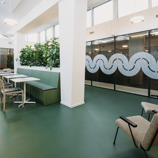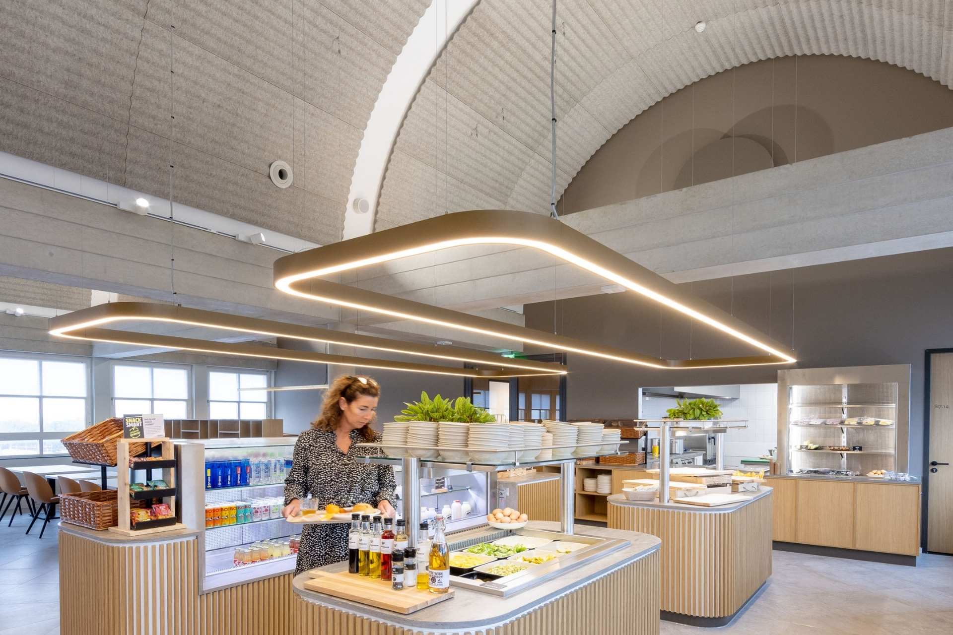 Met haar ‘manufaktur’ ontwikkelde TRILUX drie op maat gemaakte, van hout vervaardigde, gependelde lichtsystemen die het restaurant boven de koelmeubels en de voedingsdisplays subtiel verlichten. Deze armaturen hebben een naadloos, ononderbroken lichtgevend oppervlak en zijn speciaal voor dit project ontworpen en geproduceerd. De overige decoratieve armaturen werden eveneens door TRILUX geleverd, wat zorgde voor een coherent en stijlvol totaalbeeld.