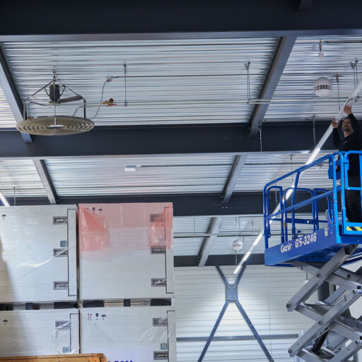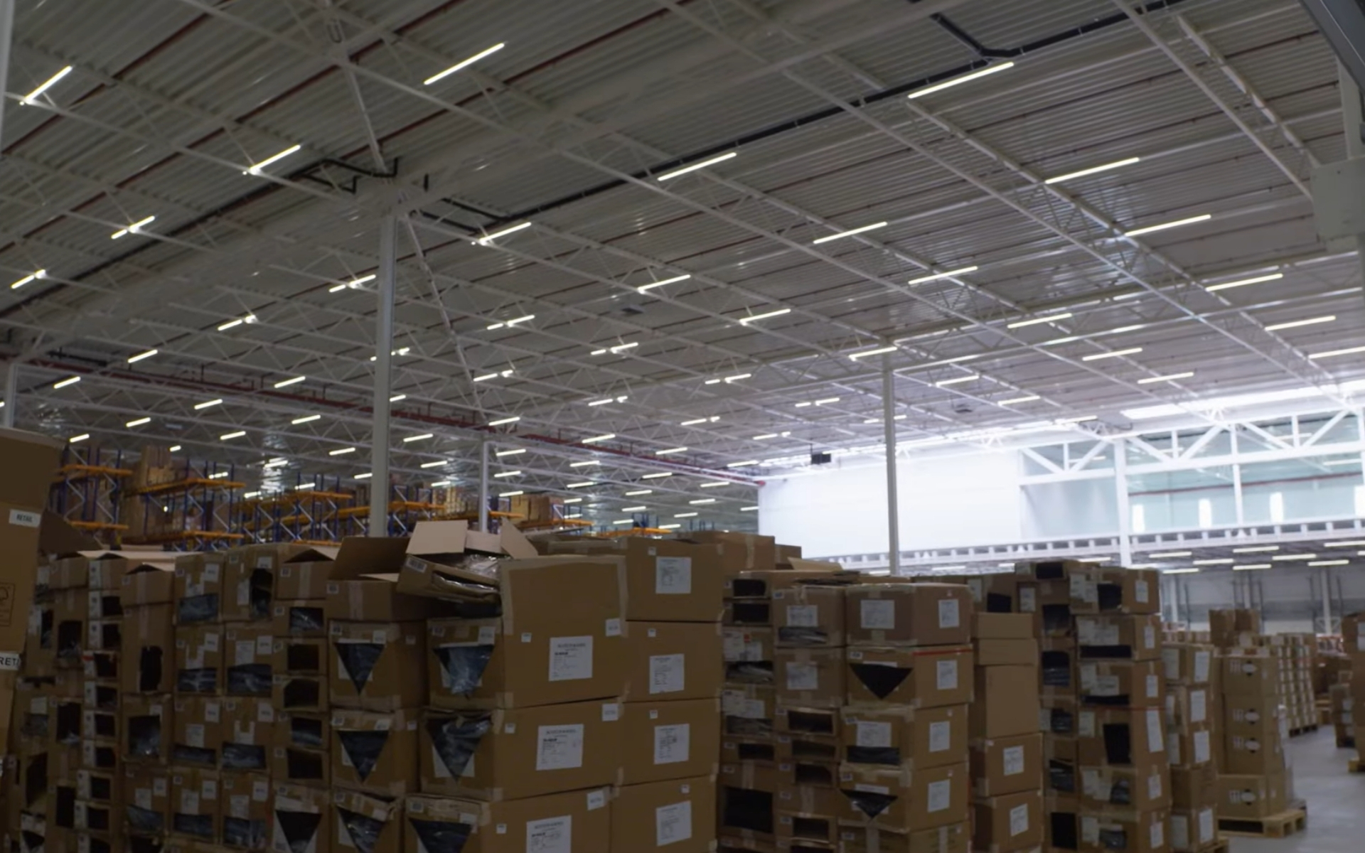De hal is voorzien van het uiterst efficiënte E-line Next lichtlijnsysteem, dat zorgt voor een gelijkmatig en verblindingsvrij lichtniveau en het magazijn functioneel en comfortabel verlicht.
