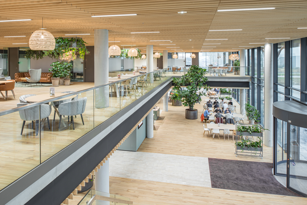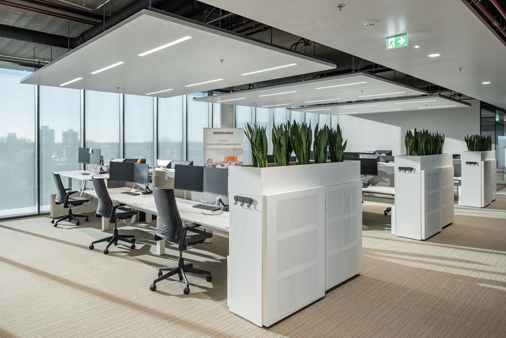 Gelijktijdig met de realisatie van het lichtplan werd samengewerkt aan het interieur- en landschapsontwerp. Dit bood de mogelijkheid een unieke oplossing te ontwikkelen voor de toegepaste hybride klimaatplafonds. Op basis van het 39G2 inleg bandraster armatuur werd een verlichting geïntegreerd die niet alleen optimale lichtkwaliteit biedt, maar ook actief bijdraagt aan de koeling van de ruimte. Zo ontstond een hoogwaardige werkplek voor de circa 1.000 medewerkers van Vanderlande, waarin comfort, energie-efficiëntie en klimaatbeheersing hand in hand gaan.