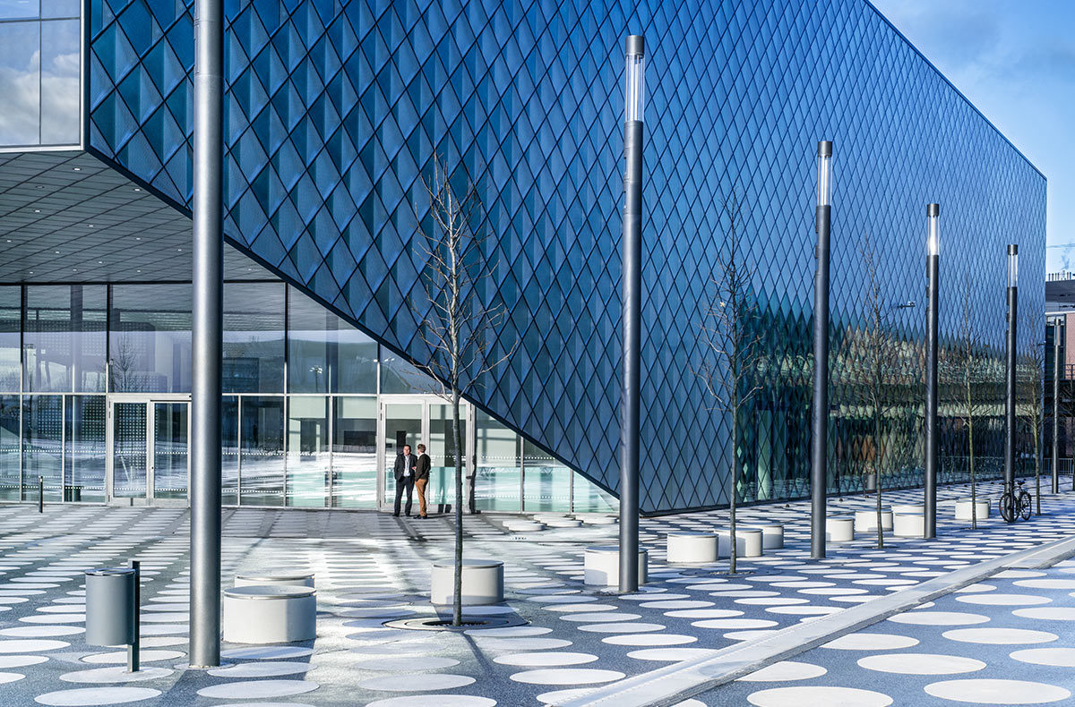 Als de lichtinval wisselt of wolken voorbijtrekken, verandert ook de aanblik van het gebouw. Men zegt wel eens dat de buitenste laag van de sculpturale constructie een door de natuur bespeelde mediagevel vormt.