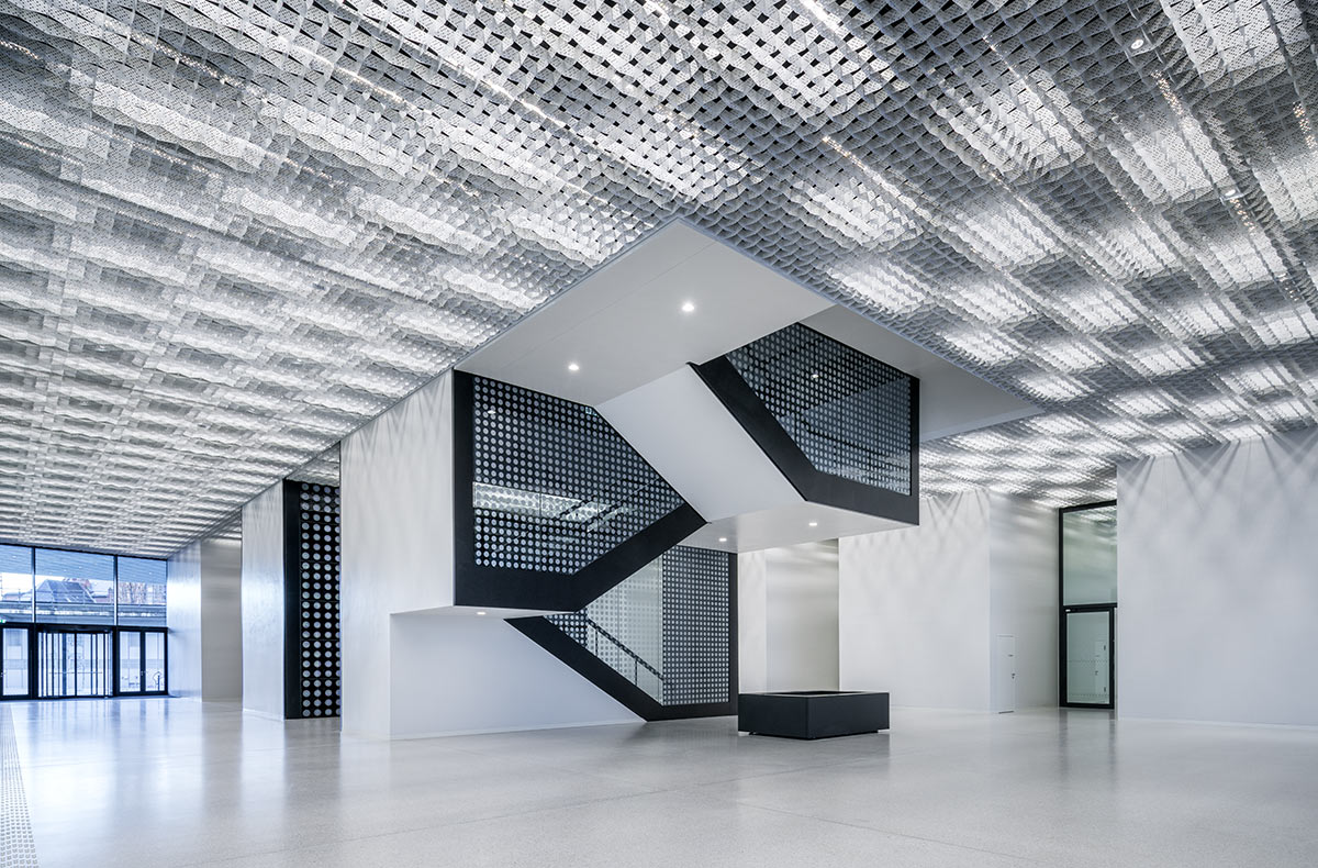Ook binnen in het gebouw is er een groot horizontaal vlak dat bespeeld wordt door licht. Een grootmetalen raster overspant de gehele benedenverdieping. Achter het grote raster van gevouwen, fijn geperforeerde lamellen gaan LED lijnarmaturen schuil. Het is dus eigenlijk een reusachtig scherm dat dynamische lichtpatronen kan weergeven!