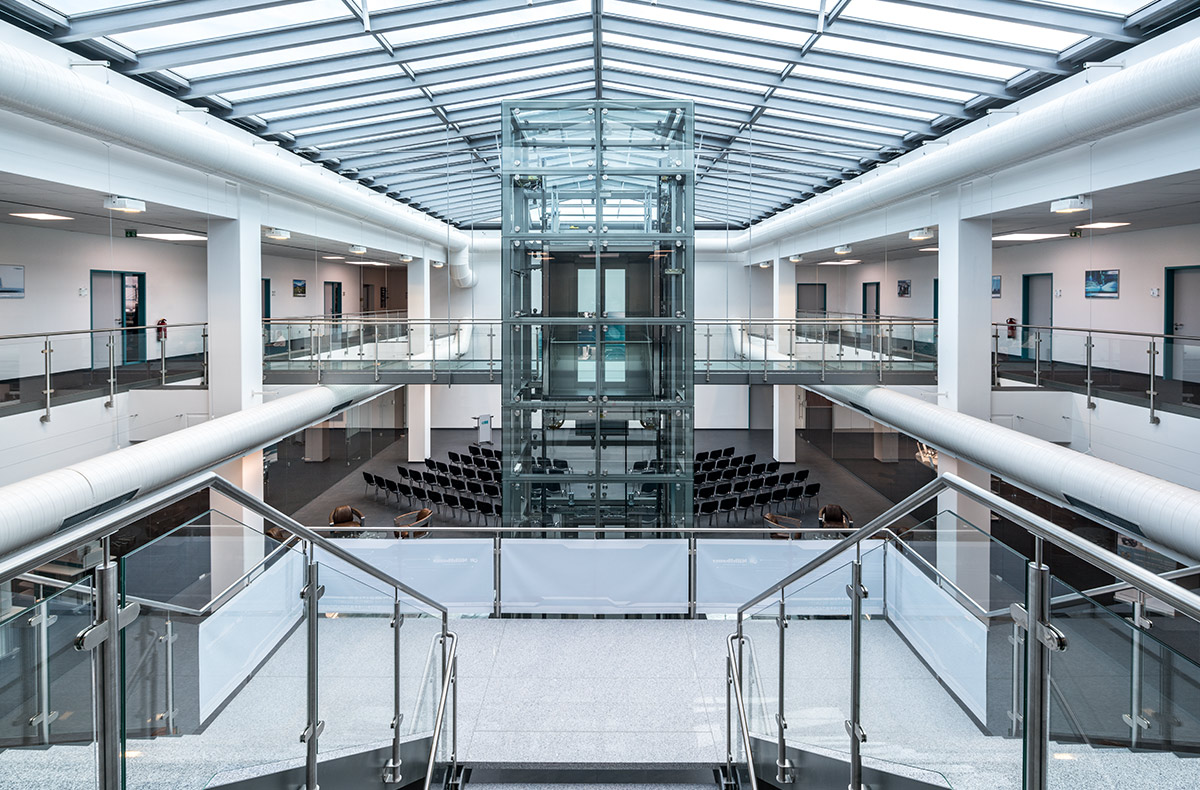 Heldere vormentaal, lichte interieurs en een indrukwekkend design. De architectuur van het hoofdkantoor van de Mühlbauer Groep is een bijzonder project. De uitstraling van het nieuwe gebouw is representatief en de gebruikte techniek optimaal. Voor de verlichting vertrouwde Mühlbauer op de knowhow van TRILUX. Van de buitenruimte en de ondergrondse parkeergarage, tot het gehele interieur van het gebouw.