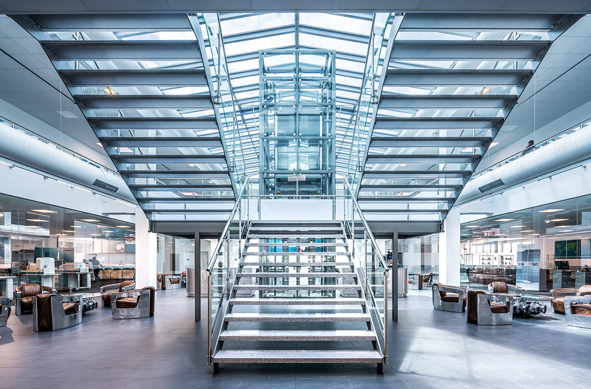 De gewenste uitstraling begint al op het moment dat je het gebouw binnenstapt. De elegante 8841 LED-paalarmaturen verwelkomen de bezoekers. Na het passeren van de hoofdingang komt men in een ruim atrium. Er zijn galerijen die zich uitstrekken over twee verdiepingen. "Samen met het glazen plafondoppervlak was dit een echte uitdaging bij de planning van de verlichting", legt Christian Wanninger uit. De functionele positionering van de lichtpunten moest in overeenstemming worden gebracht met de esthetische eisen van de architectuur. Deze taak werd opgelost met Mirona LED spots en Coriflex LED arcade daklichten, die - hoewel zij krachtig zijn - zichzelf niet optisch op de voorgrond plaatsen.