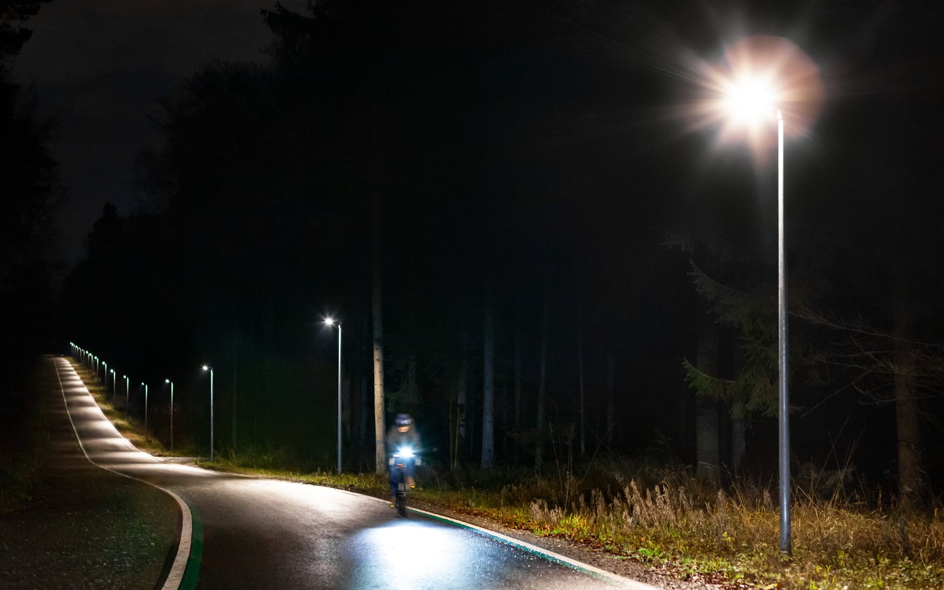 Połączenie opraw w sieć i cyfrowe sterowanie umożliwia tworzenie inteligentnych systemów oświetleniowych, które priorytetowo traktują potrzeby zarówno użytkowników, jak i środowiska. Dobrym przykładem jest ścieżka rowerowa między Stuttgartem a Böblingen/Sindelfingen (Niemcy), biegnąca około ośmiu kilometrów przez las. Tutaj zainstalowaliśmy przyjazne dla owadów i środowiska rozwiązanie, które minimalizuje sztuczne światło w nocy. Dzięki połączonym radiowo oprawom, tworzącym inteligentną sieć, stworzyliśmy inteligentną funkcję "śledzenia światła". Idea jest prosta: gdy rowerzyści wjeżdżają w zasięg wykrywania czujników, są bezpiecznie prowadzeni przez las korytarzem świetlnym. Gdy nie ma ruchu rowerowego, oświetlenie automatycznie wyłącza się po krótkim czasie, tworząc sytuację korzystną dla środowiska i budżetu. Więcej informacji można znaleźć tutaj